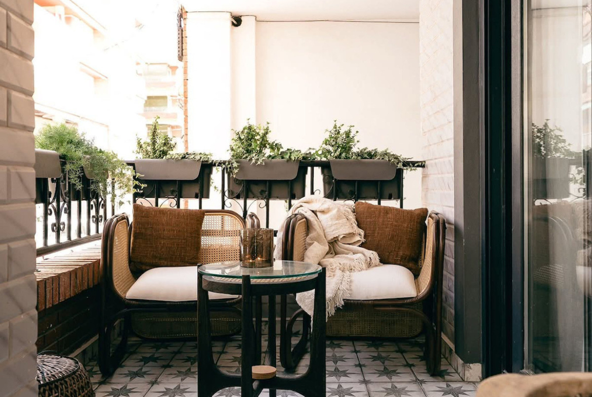 The living room with an exclusive sofa, wool rug and a vintage TV stand has access to the front terrace.