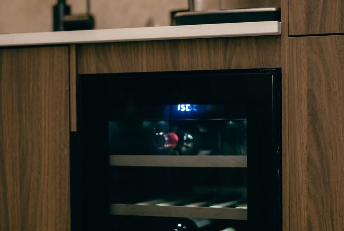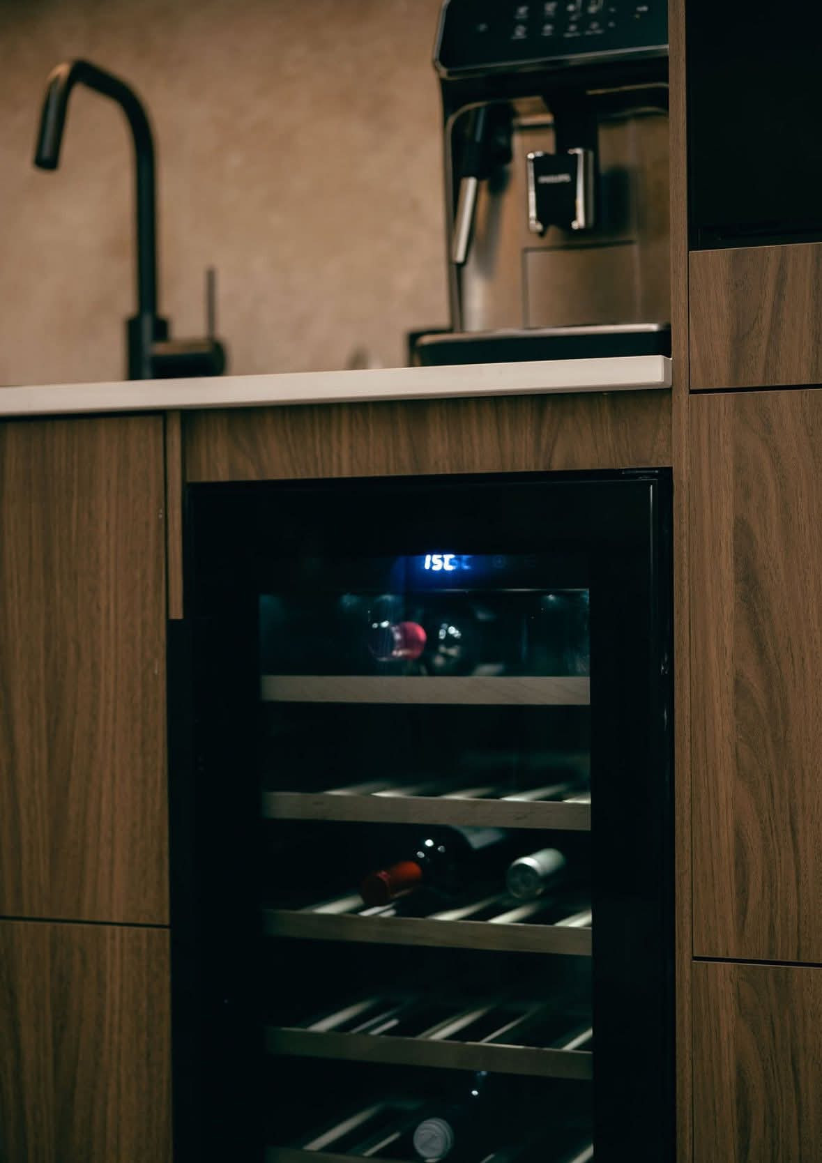The kitchen is fully equipped with double refrigerators and freezers. On both sides of the kitchen you have a sink and the stove has a built-in fan. Of course, this kitchen has a wine cooler.