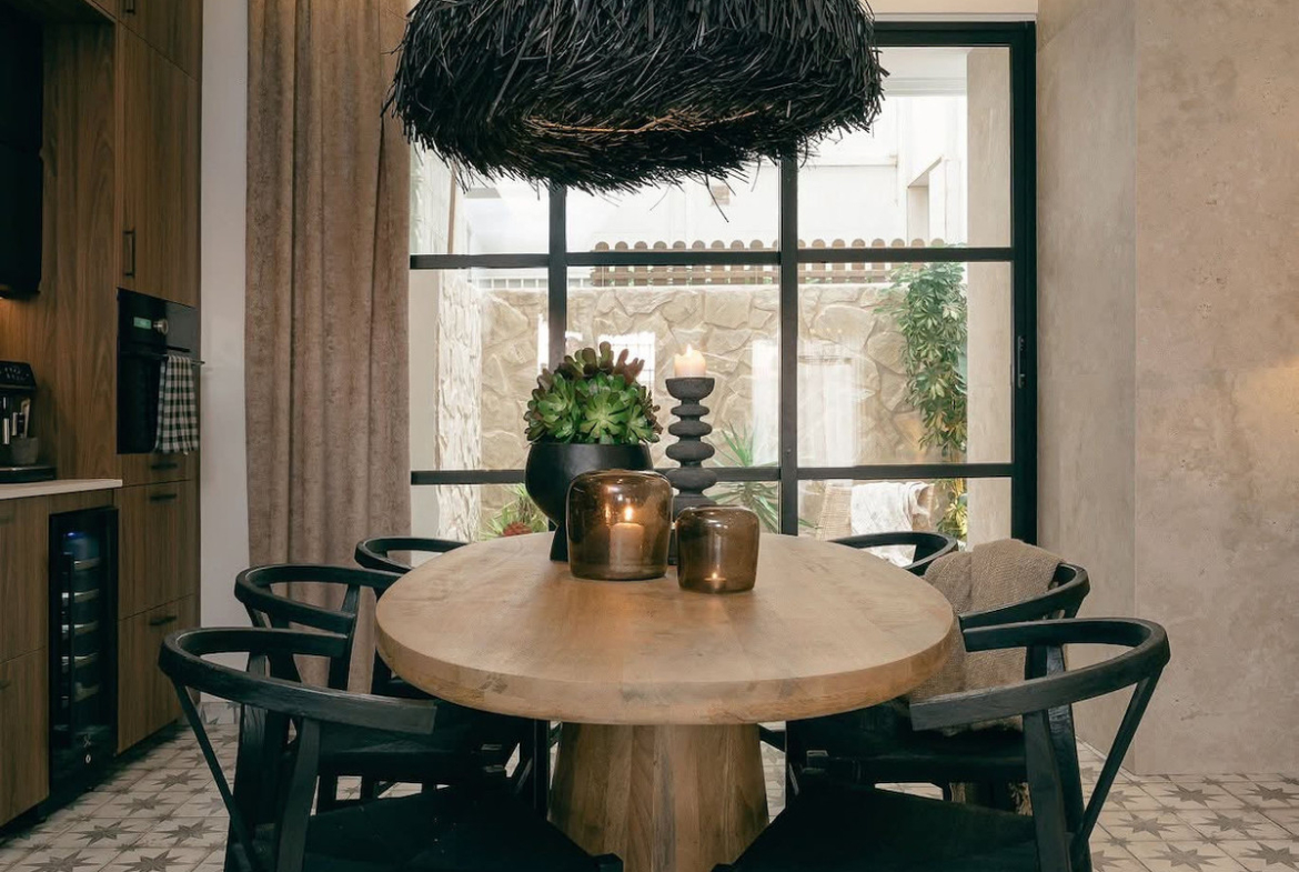 The kitchen is separated from the patio by elegant industrial-style sliding doors. On warm summer evenings you open it up and extend the dining room out.