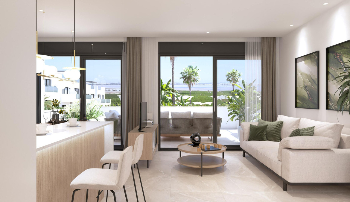 Discover the perfect harmony between luxury and comfort in our ground-floor apartments with a garden or upper-floor apartments featuring a balcony and solarium. The residences consist of two bedrooms and two bathrooms, with the option of a third bedroom to suit your needs. Each apartment offers spectacular views of the pink lagoon of Torrevieja, creating a unique experience where nature becomes an integral part of your daily life.