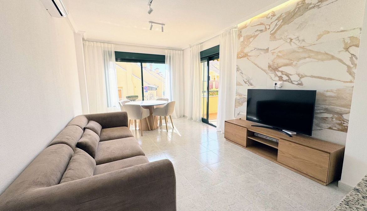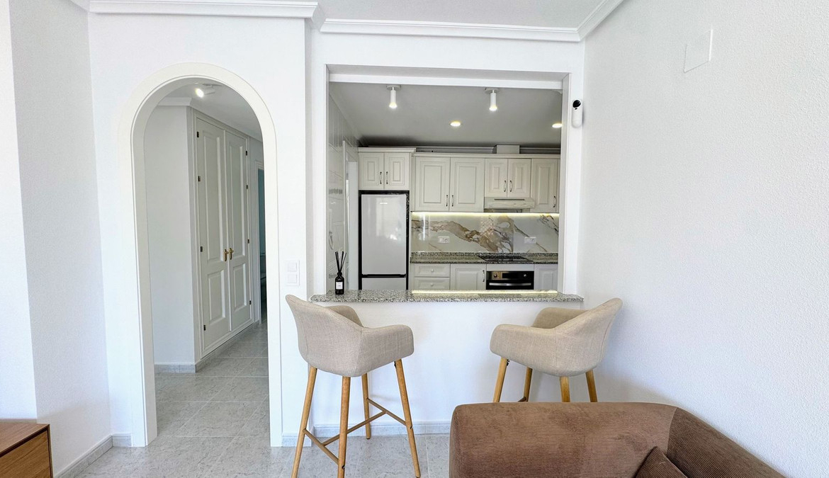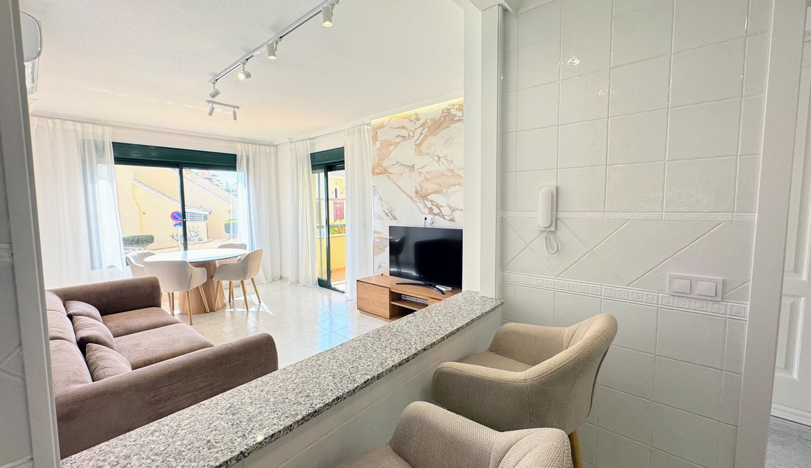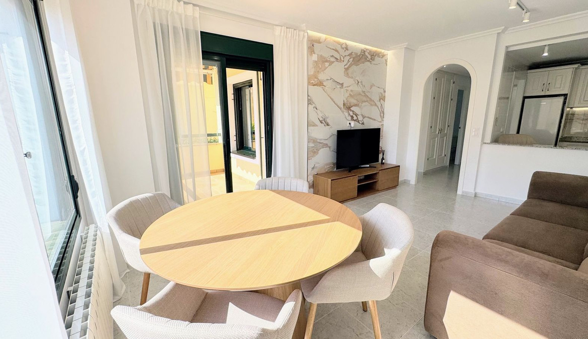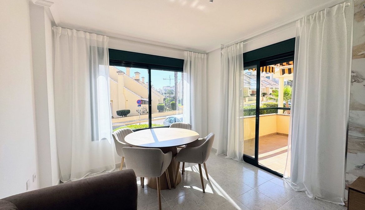 Take a look at this fabulous opportunity to purchase this Ground Floor Apartment located in the prestigous Lomas de Campoamor, a highly sought-after area renowned for its proximity to world-class golf courses. This beautiful elevated ground floor apartment has been renovated throughout and consists of 2 bedrooms, 2 bathrooms, living/dining area and a fully fitted kitchen with utility area. The property benefits from air conditioning, private terrace, communal parking, lift and is sold furnished. The complex offers a communal swimming pool with gardens,