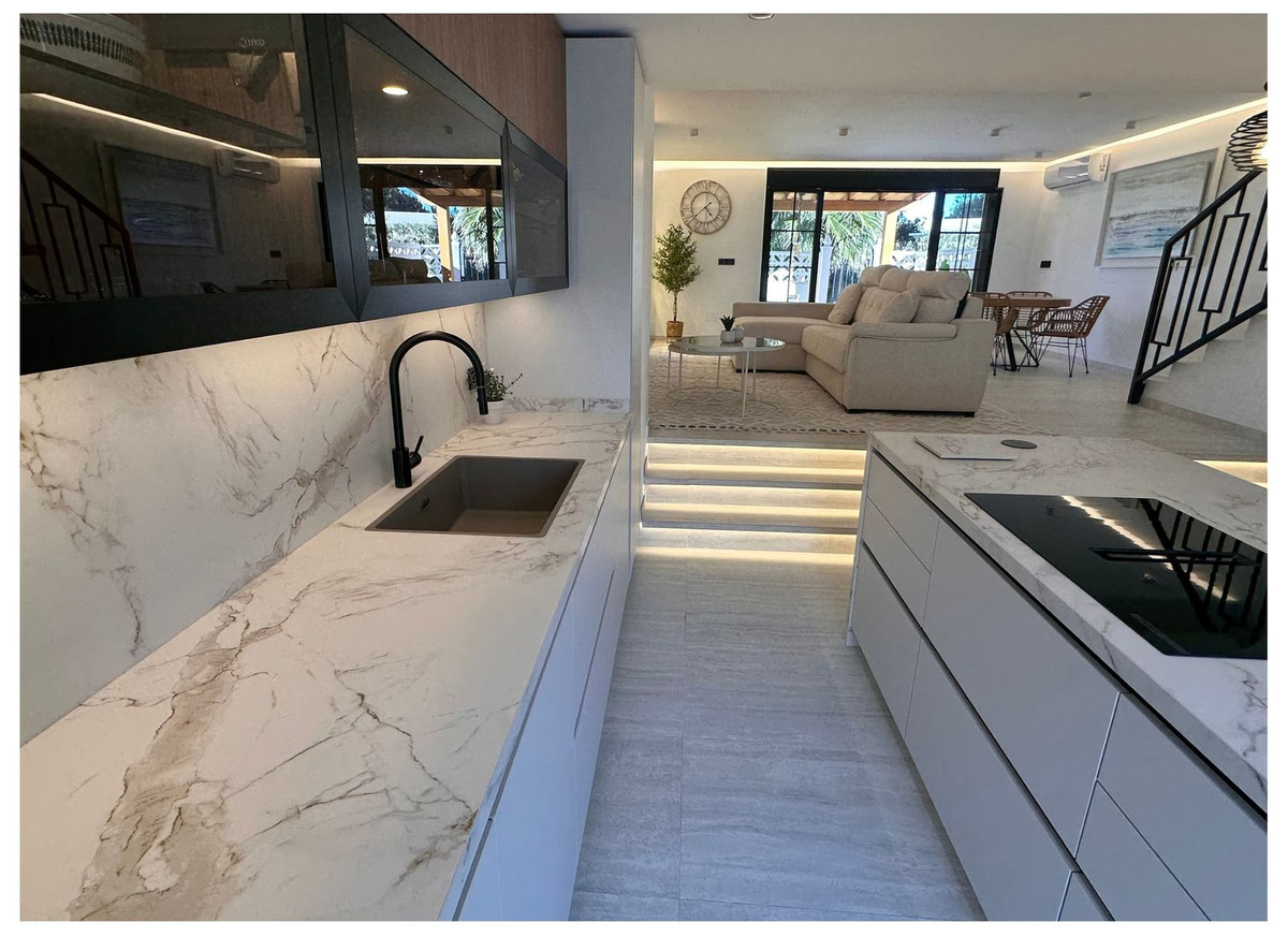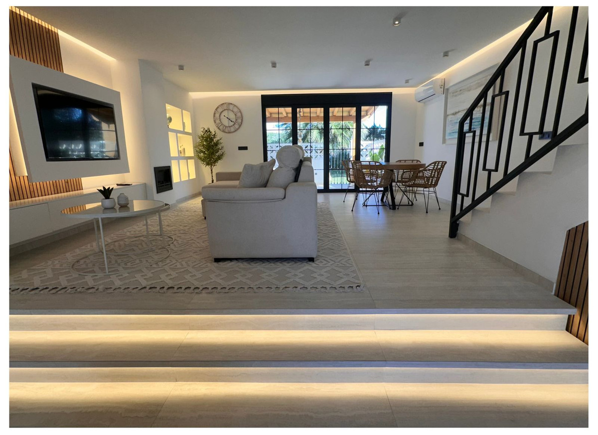 Located in a prime area, this stunning villa has been fully renovated, offering the perfect combination of elegant design, spaciousness, and functionality. With an optimized layout and high-quality finishes, this property provides a sense of tranquility and comfort, surrounded by nature and just 5 minutes from the beach.