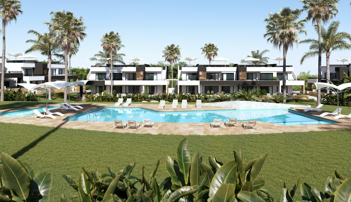 The residential complex is made up of 84 modern-style bungalows located in Lo Marabú. 2 bedrooms and 2 bathrooms distributed on one floor. Ground floor with garden or upper floor with private solarium.