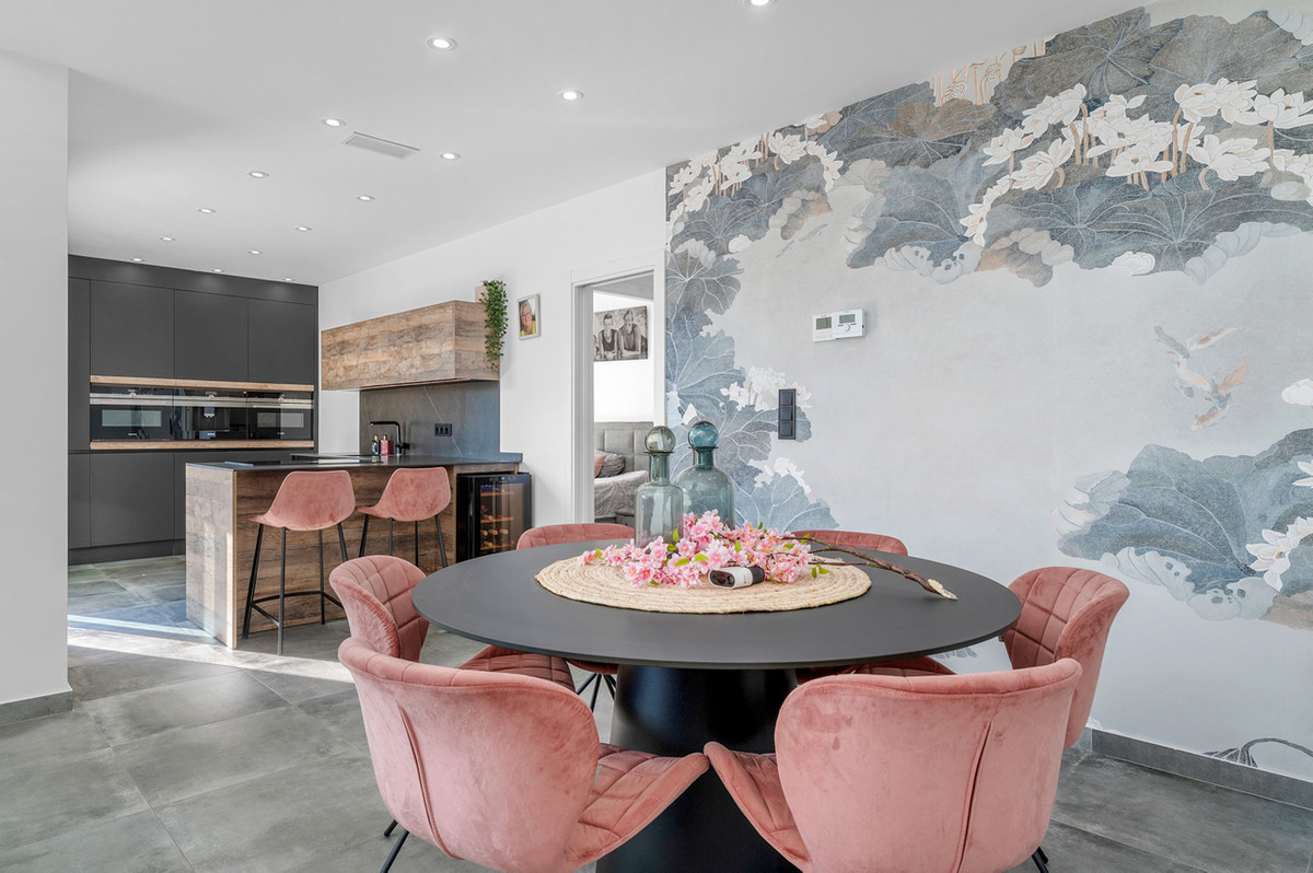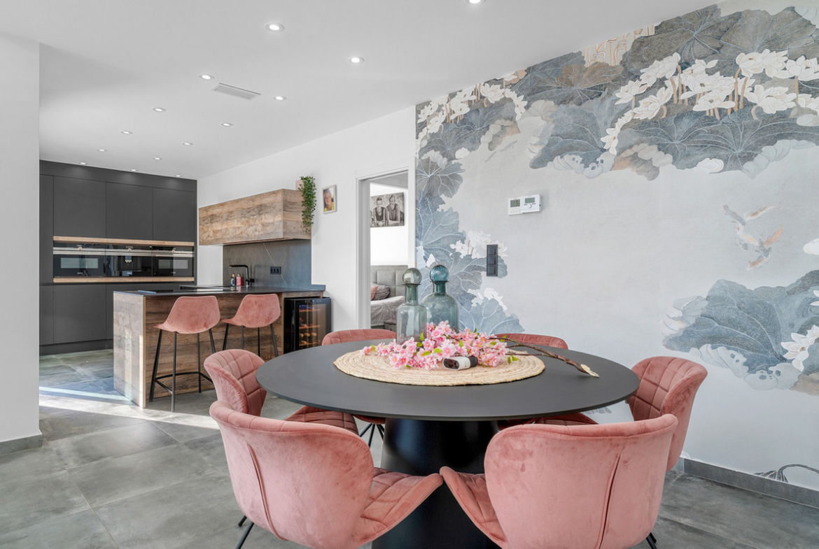 The property consists of a spacious living/dining room, a modern open plan fully equipped kitchen (Siemens appliances), two bedrooms with dressing rooms, two bathrooms, air conditioning (hot/cold) throughout the property, underfloor heating throughout the property, a large terrace/garden with a pergola and with a bbq and cozy jacuzzi area, a private (heated) swimming pool, solar panels (12), a large underbuilt and off road parking with electric entrance gate.