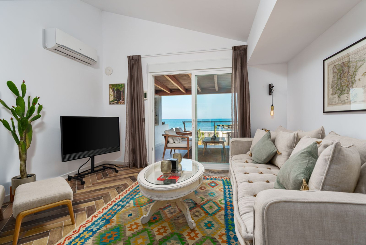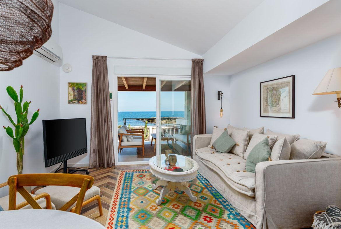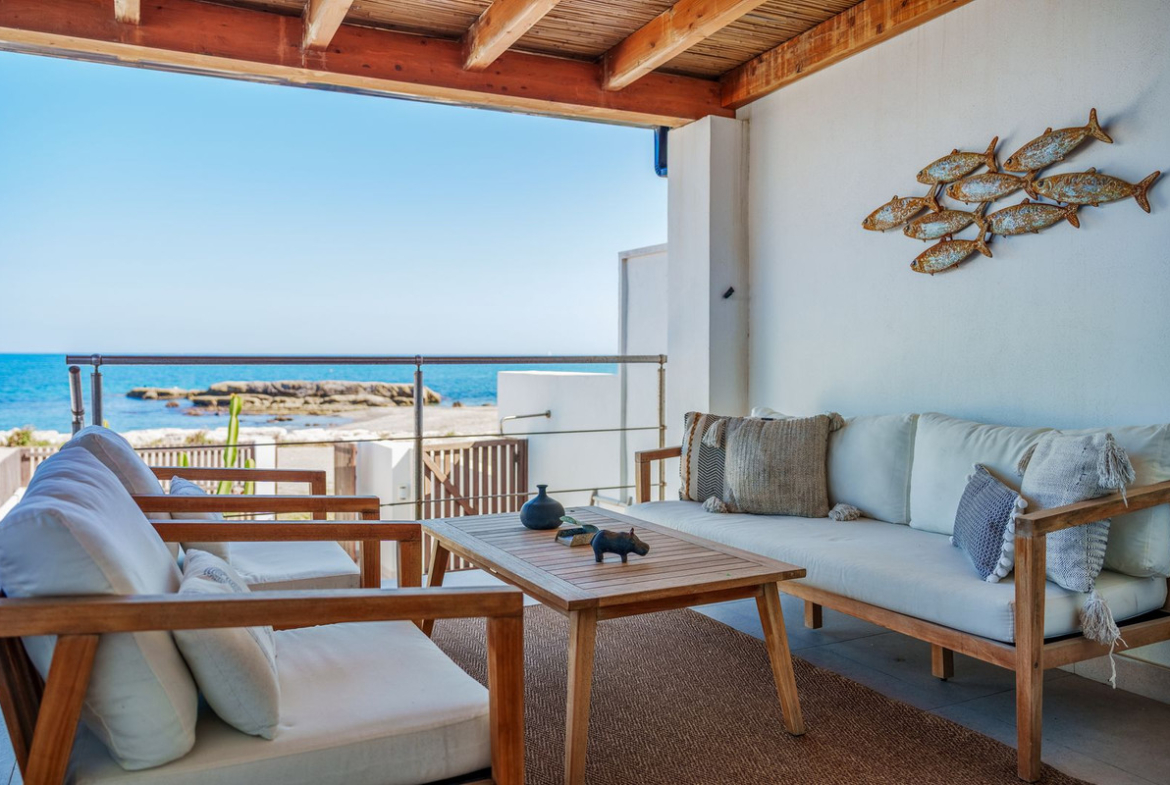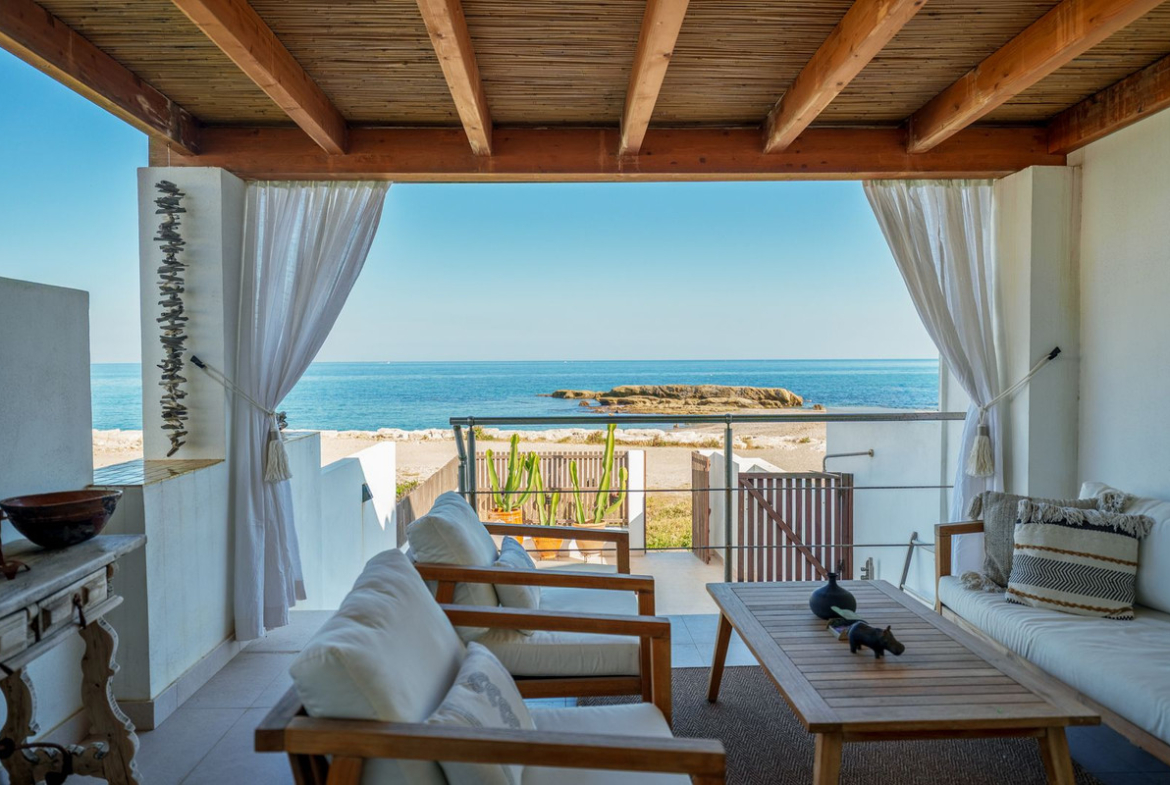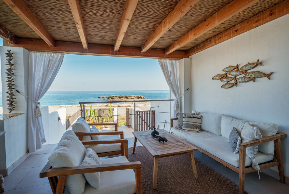 Above, the elevated covered terrace provides a sophisticated sitting area, complete with comfortable sofas and a stylish coffee table, where you can enjoy unparalleled sea and beach views from the privacy of your own retreat.