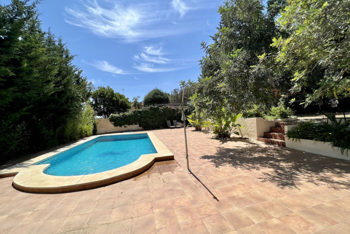 The mature garden is dominated by a majestic carob tree that provides unique shade, creating a relaxing atmosphere next to the private pool, which is directly accessible from the home.