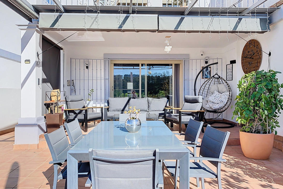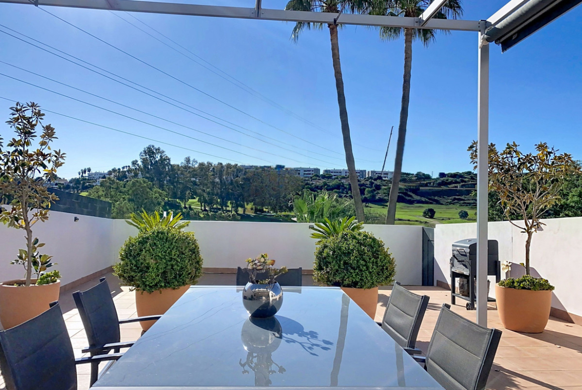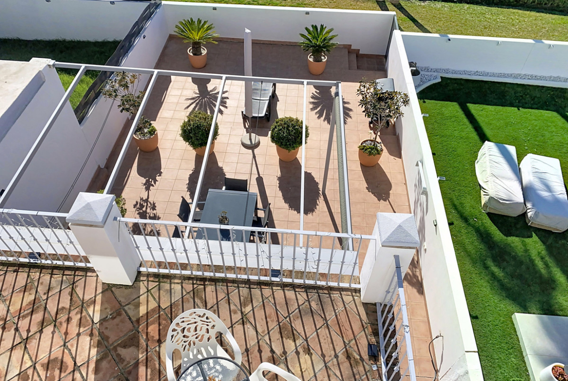 On the upper floor, the partially covered rooftop terrace offers panoramic views of the golf course, sea, and mountains, making it an ideal space for leisure and outdoor entertaining. This floor is completed by a covered laundry area, providing additional functionality to the home.
