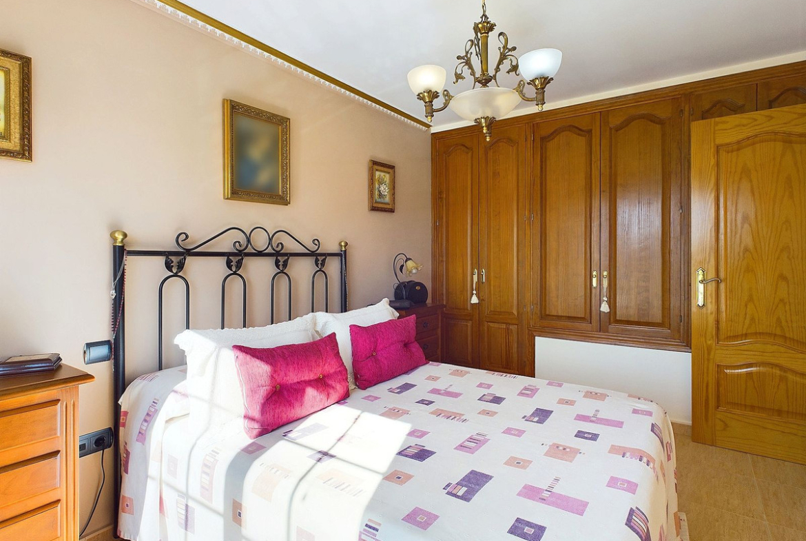 Upstairs we find 2 good size bedrooms. One of them faces north and has a walk-in wardrobe and exit to a patio from where a ladder gives access to the solarium/roof area. Here is where a more accessible terrace with stunning sea views could be developed.
