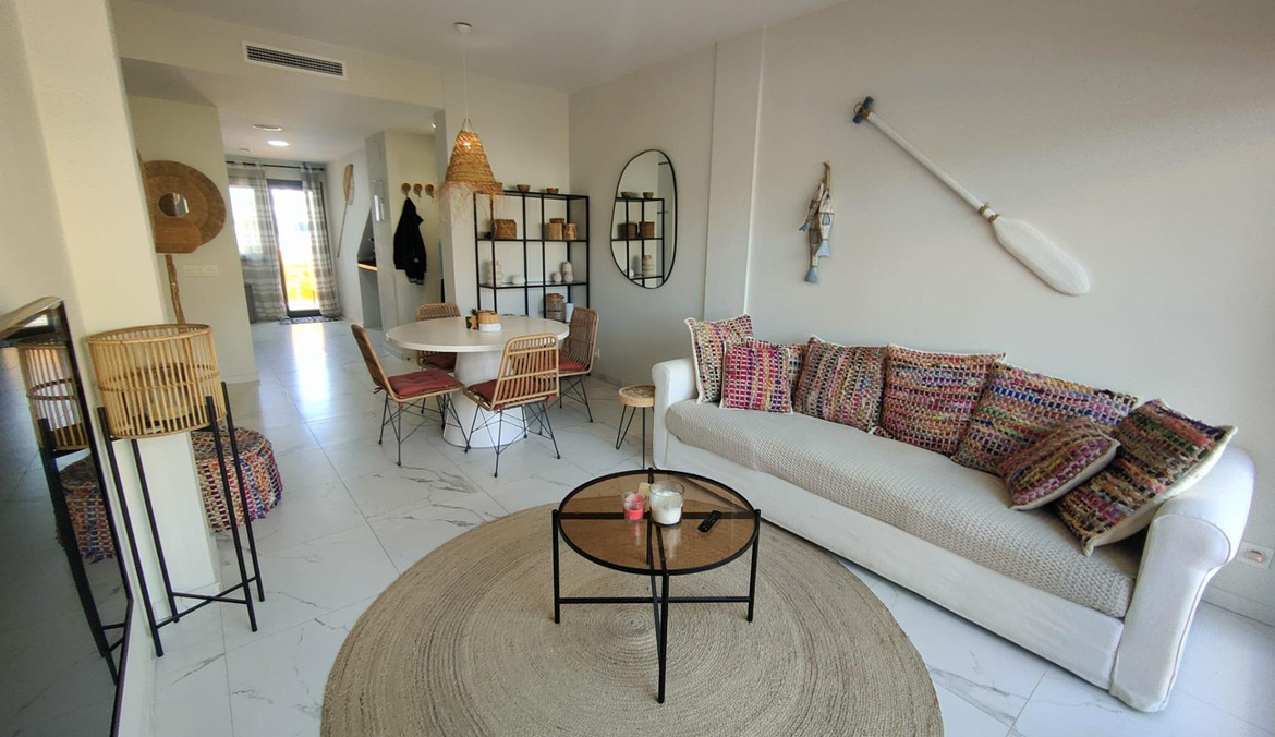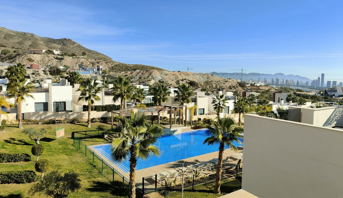 ✨ Upper floor bungalow with solarium and sea views in Alegría Village Resort – Finestrat ✨We present this beautiful upper floor bungalow, located in the exclusive Alegría Village Resort, one of the most complete and well-kept residential areas in Finestrat, with fantastic sea views and an environment designed to enjoy well-being and the Mediterranean lifestyle.The property has 2 bedrooms and 2 bathrooms, offering comfort and functionality. It has a large private solarium, ideal for relaxing, with a built-in barbecue, seating area, and open views. It comes fully equipped, including furniture and appliances, as well as solar panels for hot water, underfloor heating in the bathrooms, and electric blinds.The resort's communal areas are exceptional and designed for the whole family:???? Oriental garden with palm trees and fruit trees???? 25 x 12 m infinity pool???? 8 x 8 m Jacuzzi???? Pool bar???? Finnish sauna????️ Gym???? Children's playground and poolAll this in a privileged location, close to all amenities, with quick access to the motorway to Alicante, close to the Puig Campana golf course and just a few minutes from the beaches.✨ An ideal property for living, enjoying holidays or investing in one of the best areas of the Costa Blanca.
