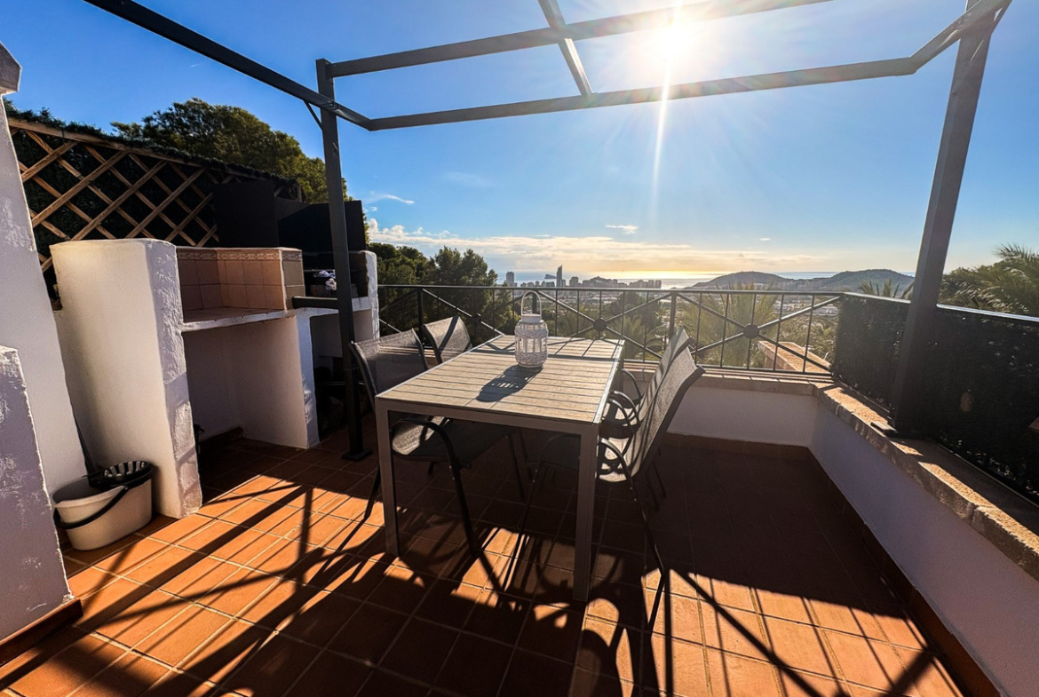 On the first floor , there is a living room , which includes a very bright, functional fireplace and access to a large east-facing terrace , from where you can enjoy views of the sea, Finestrat and Benidorm .