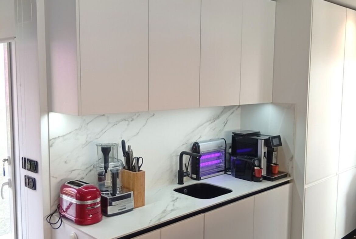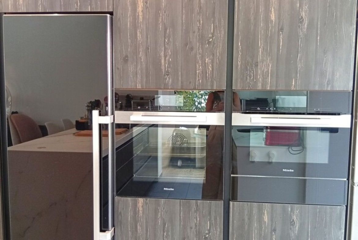 The villa features 2 spacious bedrooms (with the possibility to create a third bedroom – currently furnished as a dressing room/office), 2 modern bathrooms, a separate guest toilet, and an open plan living space with lots of natural light. The bathrooms have underfloor heating for extra comfort.The open kitchen is equipped with top-of-the-range appliances from brands such as Miele and Liebherr, which immediately underlines the quality of this property. The finish throughout the house is of a high standard, using durable, luxurious materials.