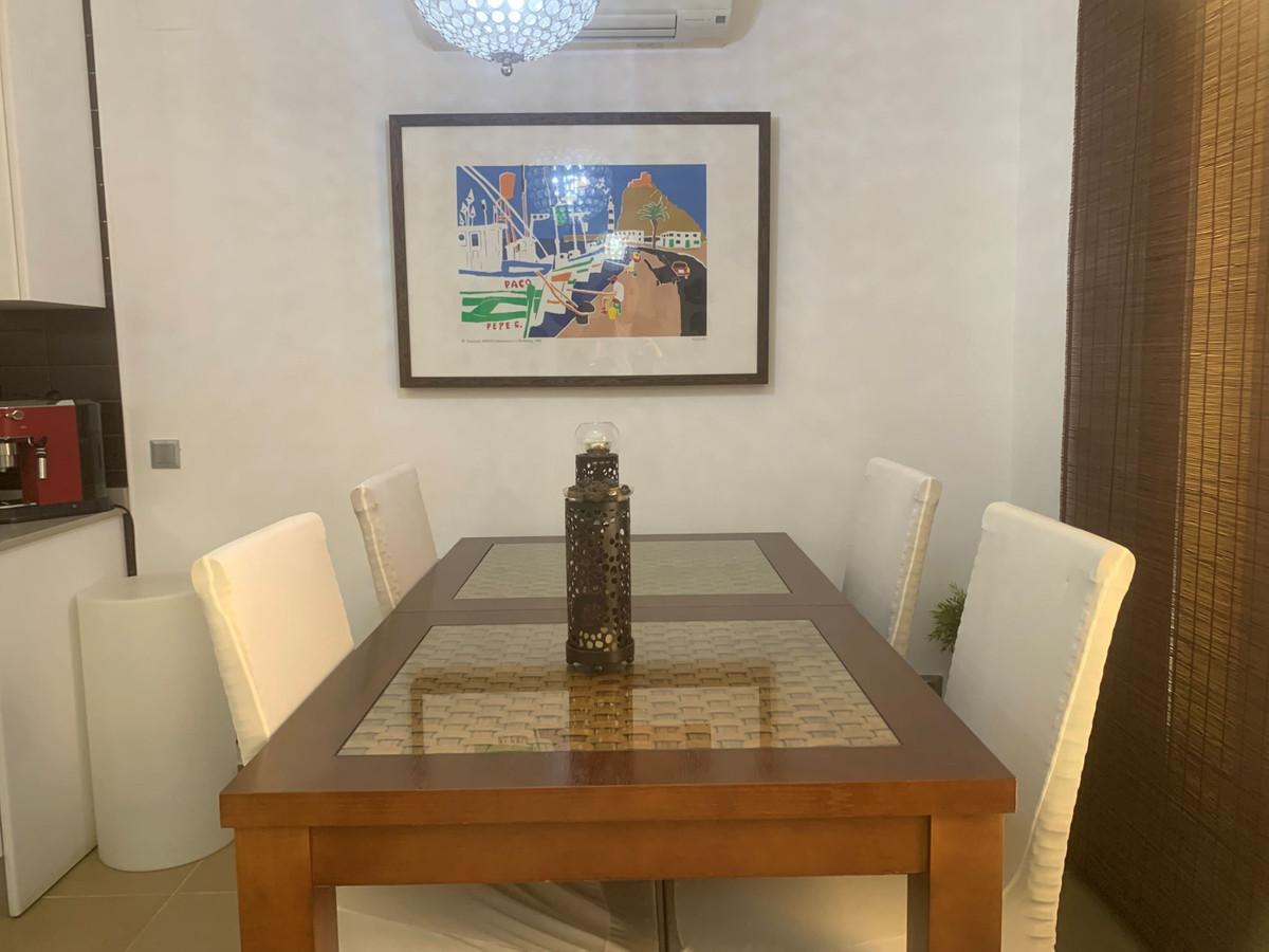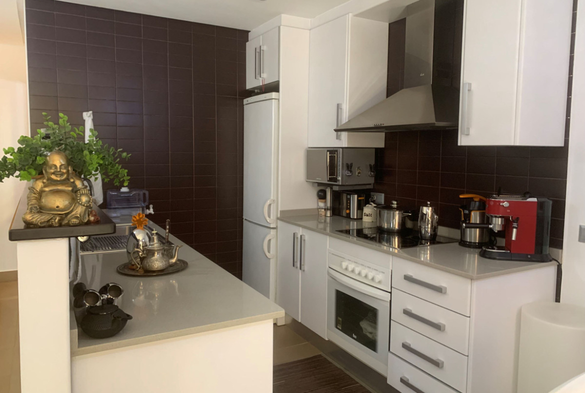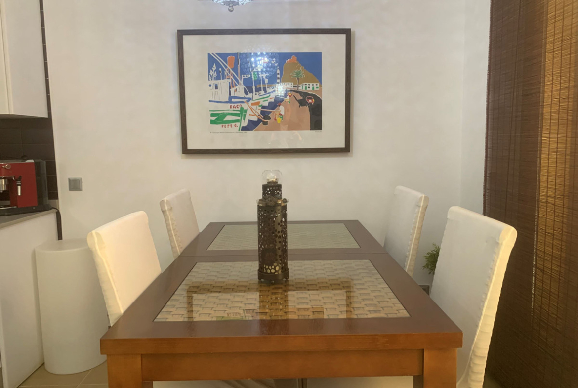 This terraced house is well planned and distributed over two floors, there are two bedrooms, two bathrooms, living room and kitchen. In addition to this, there are two patios on the ground level and a sunny terrace. In the common area there is a swimming pool. Parking options are available on the plot or on the street.