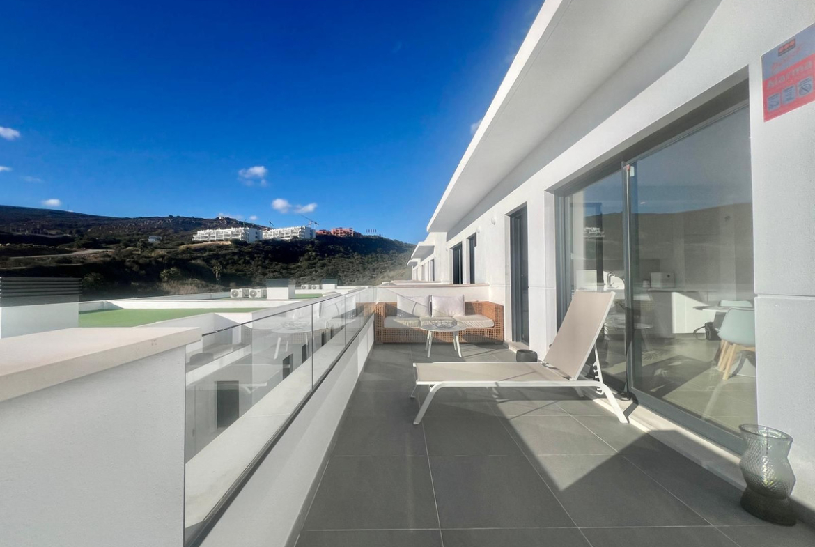 From the moment you enter, a welcoming entrance hall leads to a spacious, light-filled living area featuring an open-plan kitchen, dining area, and a comfortable lounge. This space opens onto a large terrace, a true extension of the interior, offering spectacular views of the sea, Gibraltar, the coast of Morocco, and the surrounding hills. Thanks to its ideal south to south-west orientation, the house enjoys optimal sunlight throughout the day. The property can be accessed directly from the underground parking, with a private entrance leading straight into the house. A laundry room completes this property. The house is sold fully furnished. The development, completed in summer 2025, is a contemporary residential complex consisting of 46 semi-detached homes, designed to offer exceptional panoramic views of the Mediterranean, just a few meters from the beach. The complex stands out for its high-quality materials, generous living spaces, and exclusive amenities, including an infinity pool, gym, and spa. Ideally located close to golf courses and marinas, it is just 15 minutes from Gibraltar Airport and a short distance from Estepona, La Duquesa Port, Sotogrande and only less than 30 minutes fromPuerto Banús, and Marbella. An exceptional property, ideal as a primary or secondary residence or as a high-quality investment, set in a natural and exclusive environment, perfect for enjoying the Costa del Sol climate and the Mediterranean Sea. A must-see!