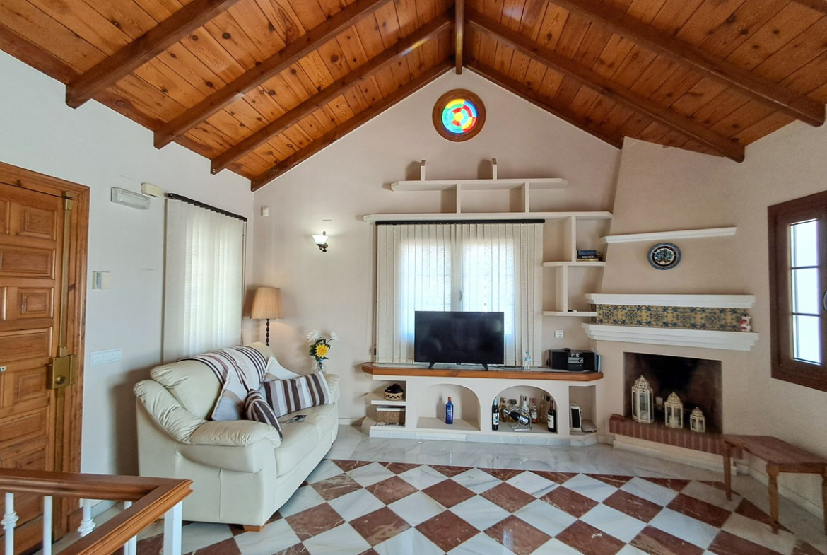 Thoughtfully laid out across two levels, the home exudes timeless Mediterranean elegance with refined finishes, quality craftsmanship, and an atmosphere of sophistication. The upper level welcomes you with a spacious and light-filled living room, where a striking traditional fireplace adds warmth and character. Adjacent is a fully independent kitchen, perfect for entertaining or relaxed day-to-day living, and a stylishly finished guest bathroom. From the living space, step out onto the expansive terrace, where you’ll find breathtaking open views of the countryside, golf course, and community bowls area—an ideal setting for al fresco dining or peaceful sunset evenings. A retractable awning provides shade and comfort year-round.