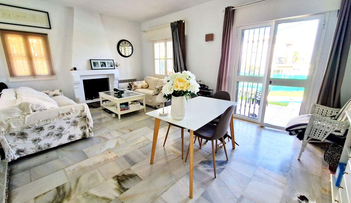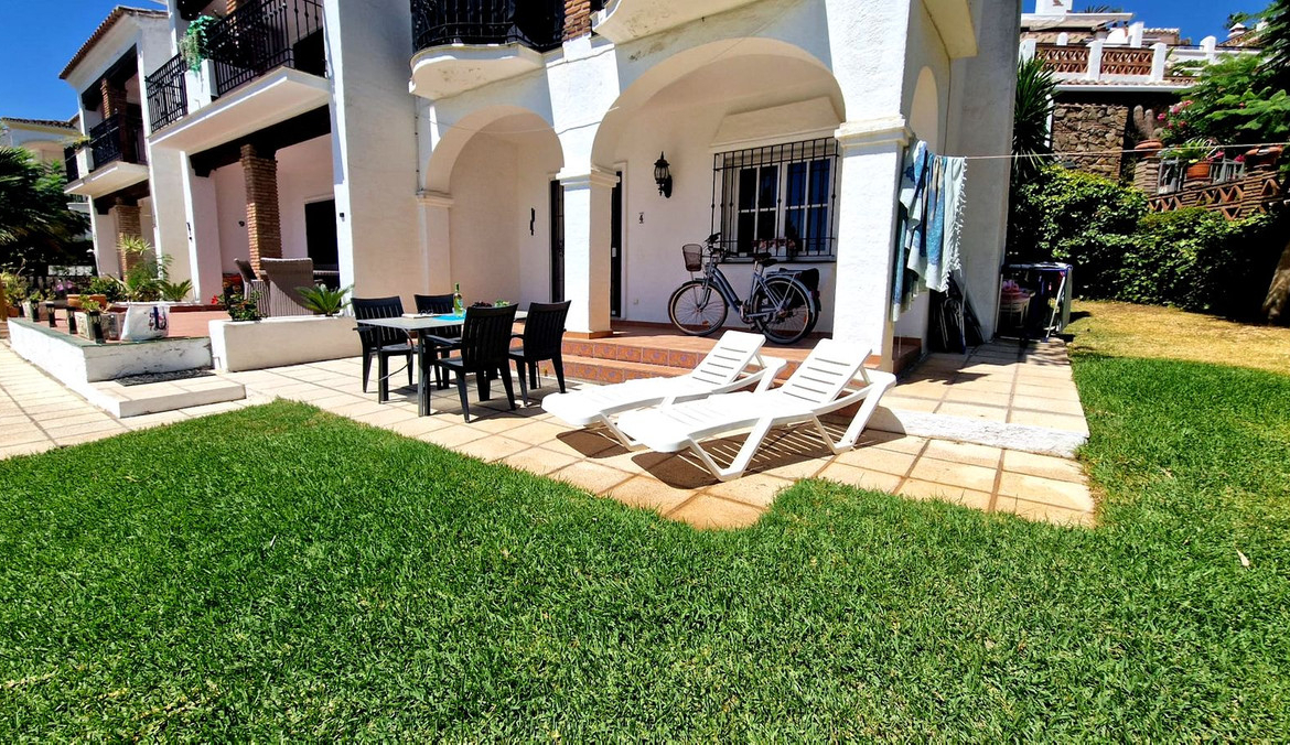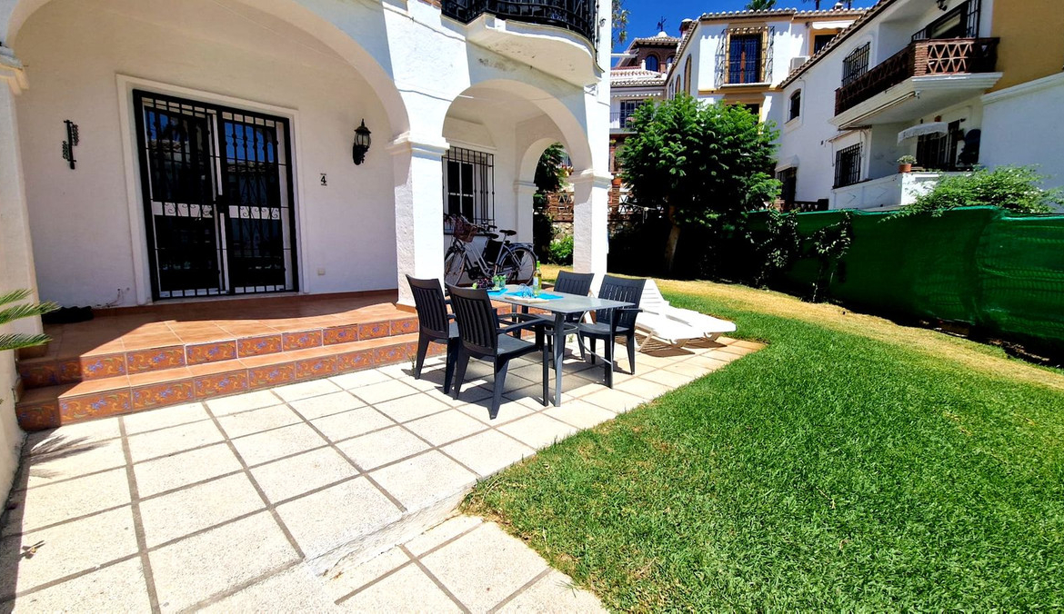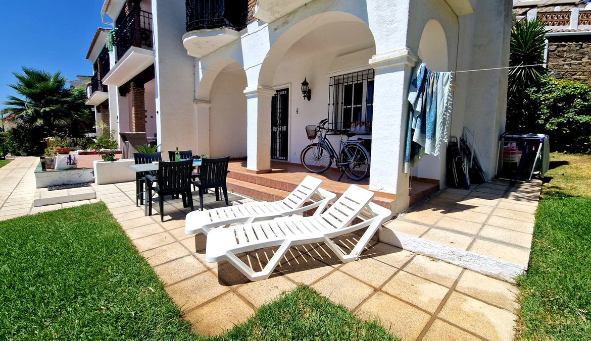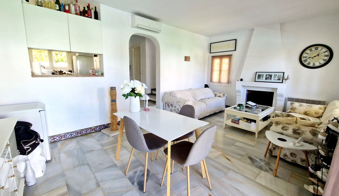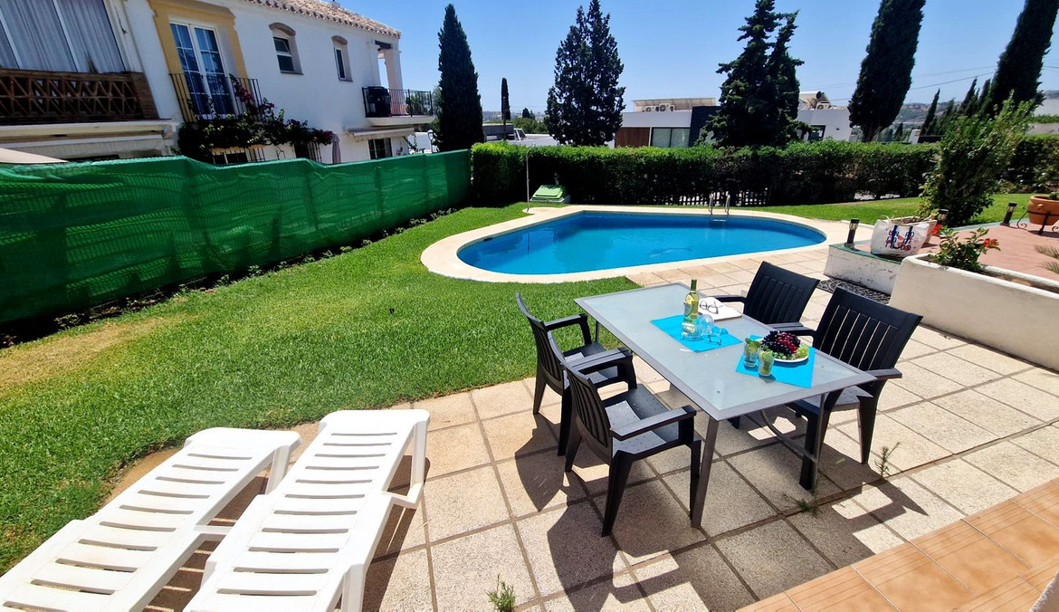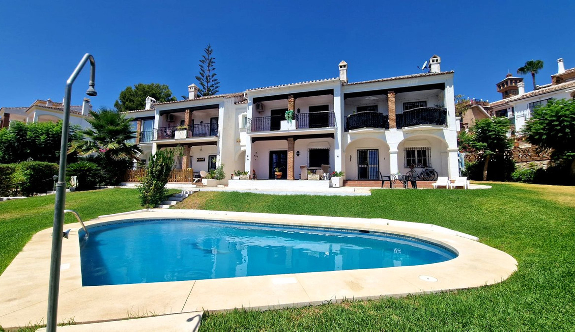 Beautiful end of terrace townhouse with sunny terraces in Mijas Golf. This property is set in a small urbanisation of 4 houses with a lovely pool area with grass, and also one paking space for each property. On the ground floor you have the kitchen, a cloak room, and lounge dining with fire place and air conditioning. On the upstairs you have 2 double bedrooms with fitted wardrobes,air conditioning and terraces with fantastic views, plus a family bathroom. Cozy and well presented, this property offers an excellent market price.