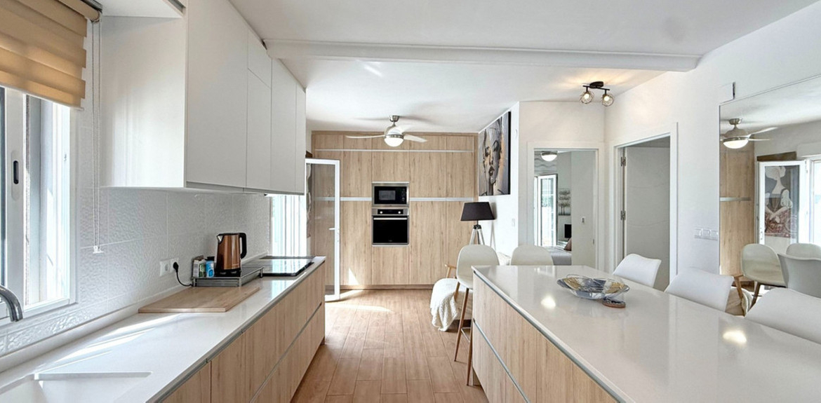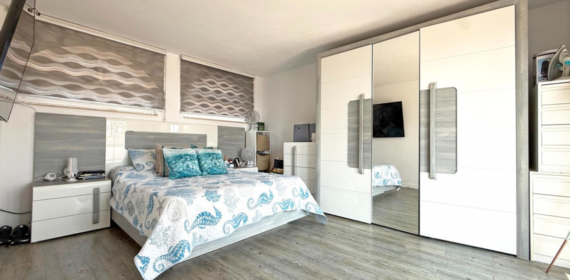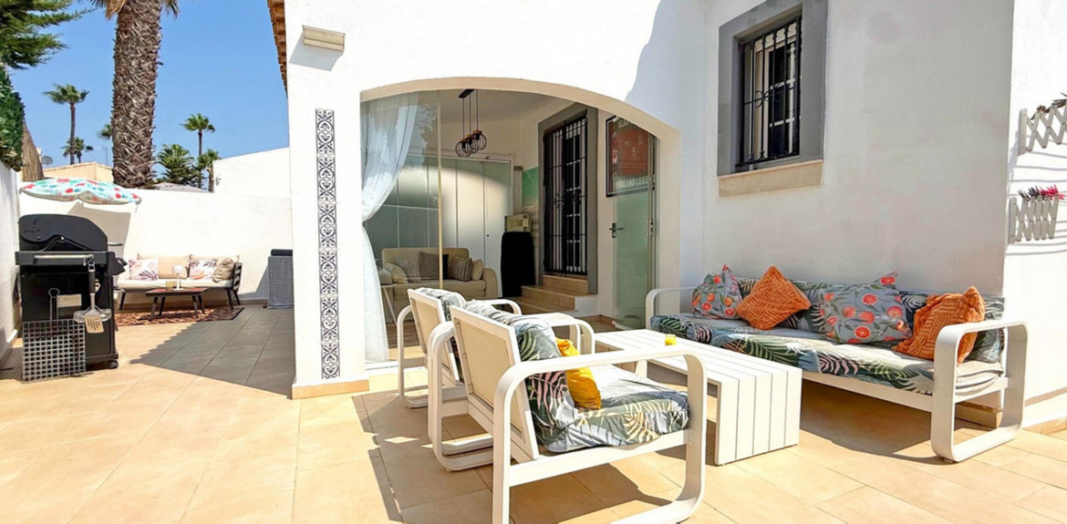 The guest bedroom opens onto a private patio, also fitted with glass curtains, while the master bedroom boasts a generous solarium with stunning sea views. Additional highlights include air conditioning throughout, optional central heating, two large storage rooms, and an excellent location in a quiet and private area of Villamartin. All this just a short walk from the famous Villamartin Plaza and the golf course.