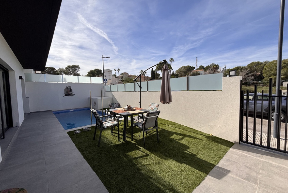 This charming home comes fully furnished and features a private pool, private parking, front and rear garden areas, a bright open-plan kitchen, air conditioning, solar system, electric shutters, 3 terraces and a stunning solarium — ideal for relaxing or entertaining under the Spanish sun.
