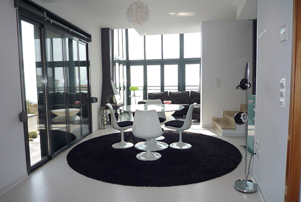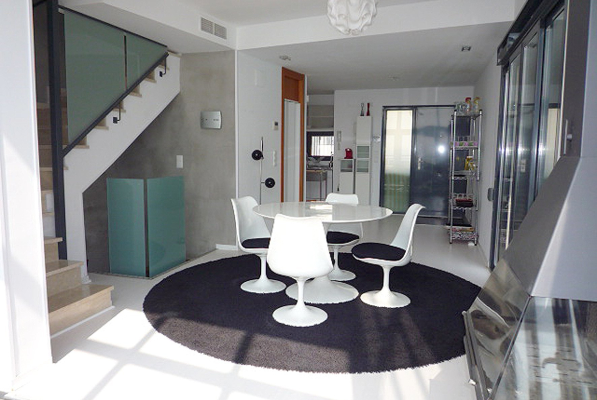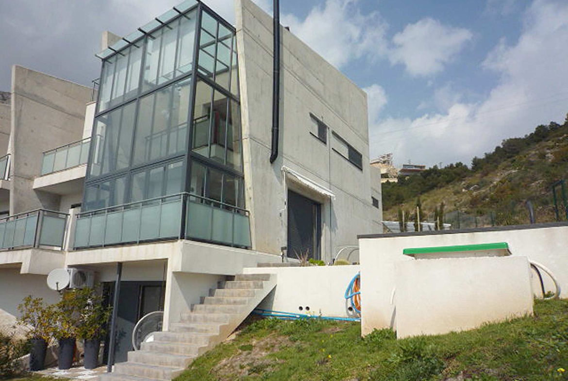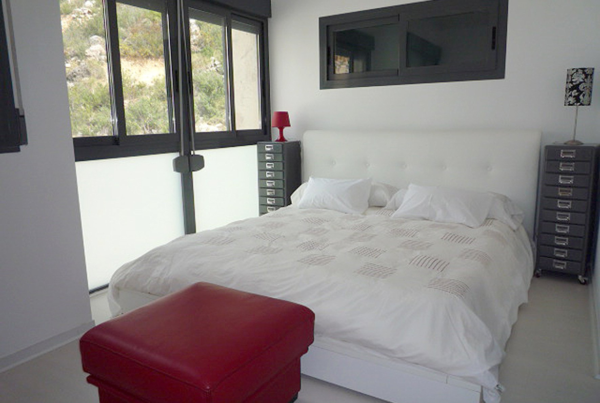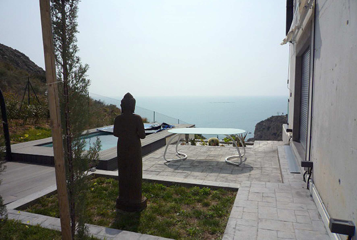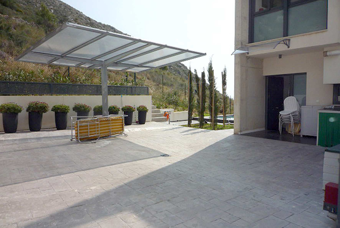 Spectacular semi-detached villa in Art Nouveau style seafront , facing south in Calpe , Costa Blanca, Alicante. It has two floors connected with internal staircase, a covered terrace and a basement built post that also communicates with an internal staircase. The property was built in 2008 and has been completely renovated in 2009 , joining the outdoor terrace on the ground floor in the housing via a panoramic glass connecting the two floors. The ground floor comprises a living room with fireplace and incredible sea views, kitchen and toilet. Upstairs there is a master bedroom with bathroom and dressing room, which through a balcony directly overlooks the living room. In the basement there is a large room and bathroom very modern style with direct access to garden . From the top floor direct access to a terrace solarium deck, designer bath . It also has a private garden with pergola and private parking for two cars. Private pool in the