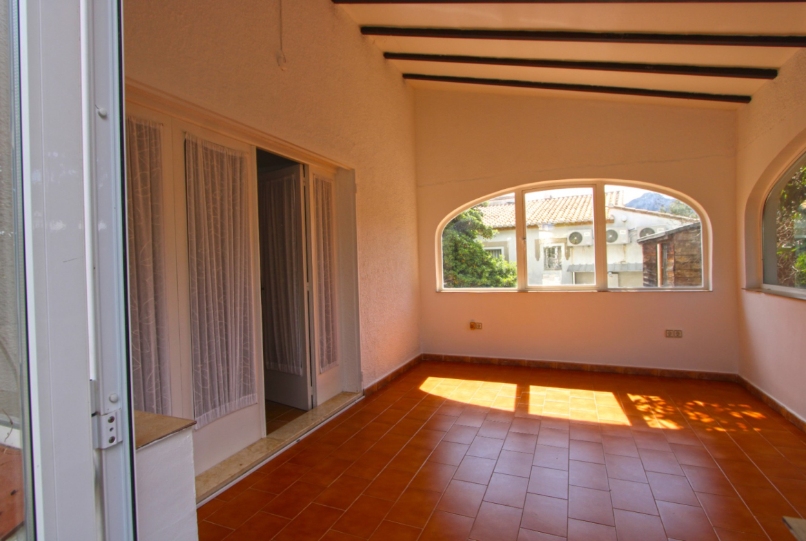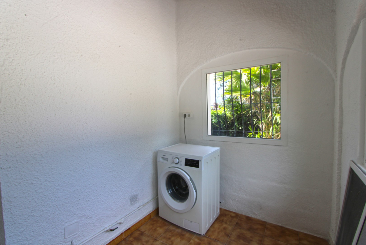 A single storey, 2 bedroom villa in a very private location close to the village of Orba. The property is approached via a long drive with off road parking for 3 or 4 cars and is located on a totally flat plot. The villa itself an open plan living room and kitchen plus a utility room. There is a glazed nyah which would make a perfect dining room plus 2 bedrooms and one family bathroom. Outside there is a pool with a large pool terrace area and also a large garden area. It is unusual to have such a relatively large flat plot in this development and would make either an ideal family or holiday home. The property does need some updating but has a great deal of potential and is ideal for anyone looking for a property with a minimum of steps.
