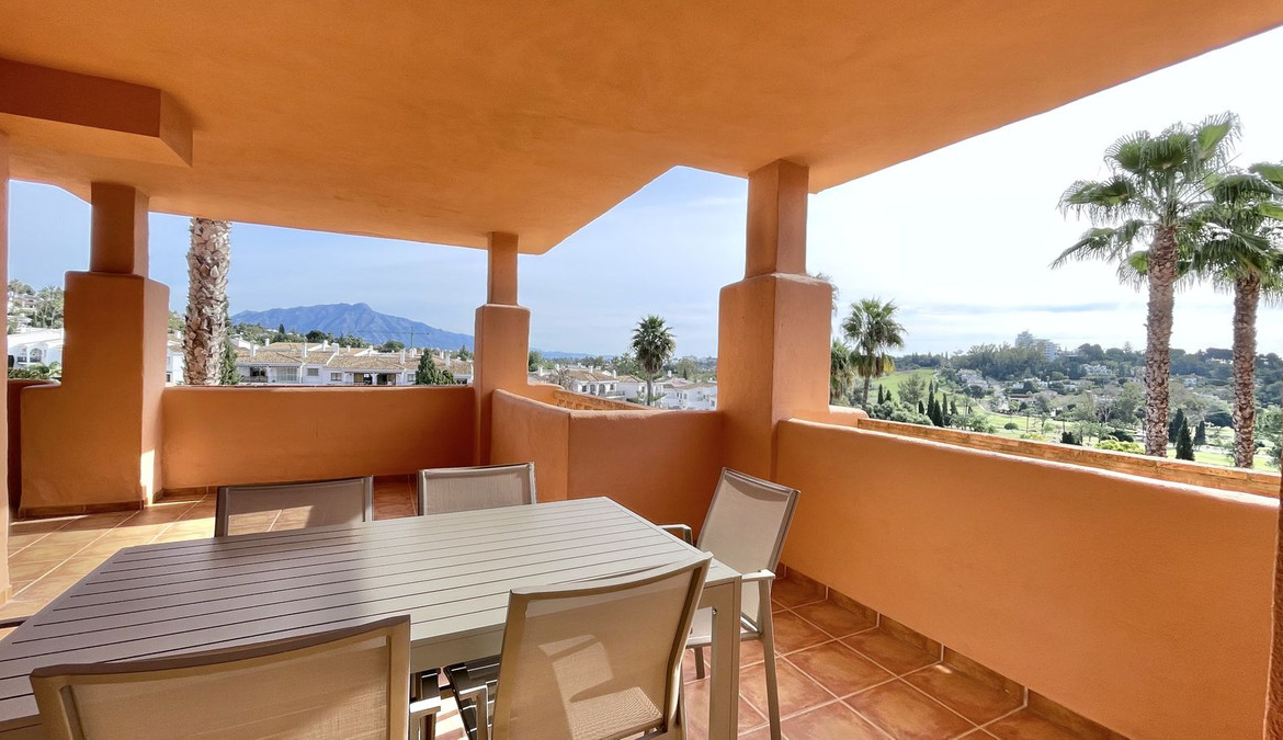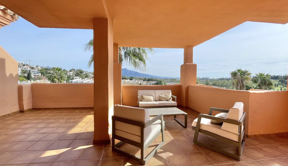 Surrounded by extraordinary large terraces on the south, east and west sides on both levels; and with access from the living room, master bedroom, second bedroom and top of the stairs; providing ample outdoor space and panoramic views of the La Concha mountains and the renowned El Paraíso Golf Course; this duplex penthouse boasts a fully fitted modern kitchen, a spacious living room, and elegant guest bedrooms along with a guest bathroom. The top floor is dedicated exclusively to the master bedroom, complete with an ensuite bathroom and two terraces.