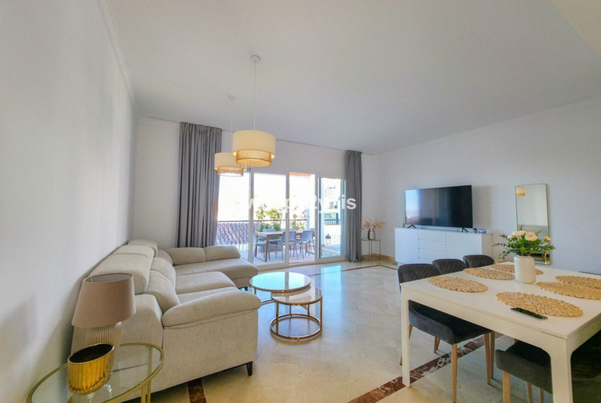 Inside, the open-plan living and dining area is bathed in natural light, thanks to large sliding glass doors that create a seamless connection to the terrace and enhance the indoor-outdoor lifestyle so characteristic of the Costa del Sol.