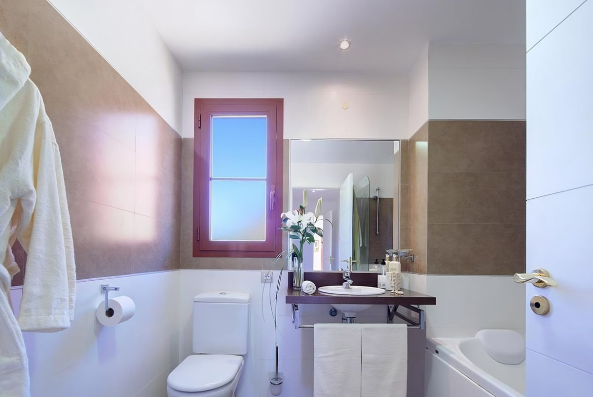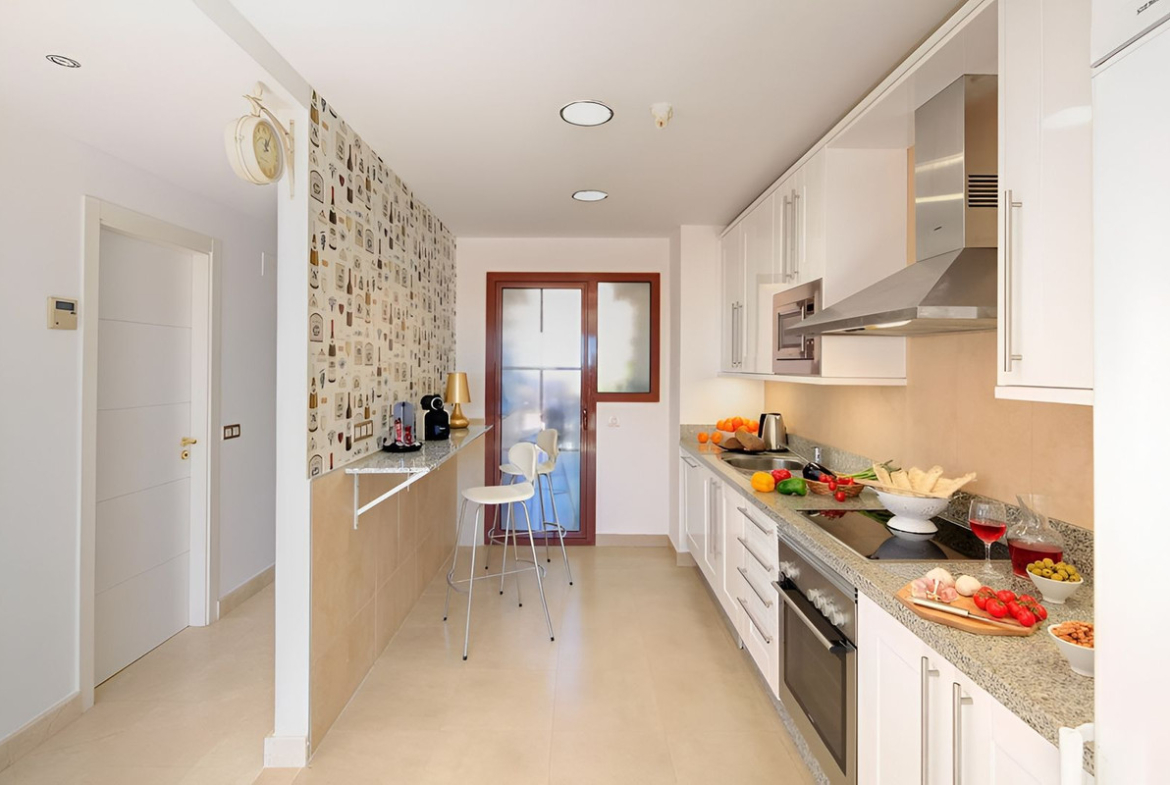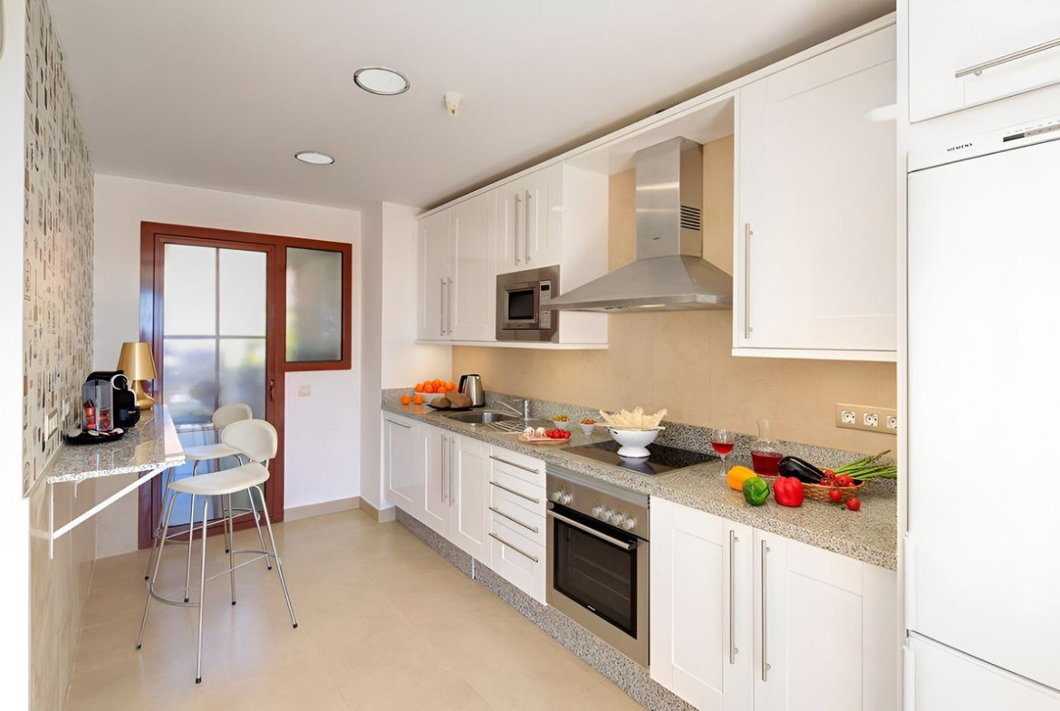 The master bedroom comes with an en-suite bathroom and direct access to the terrace. Two additional bedrooms share a modern bathroom. The property is equipped with air conditioning (hot and cold), marble flooring, fitted wardrobes, and high-end finishes throughout.