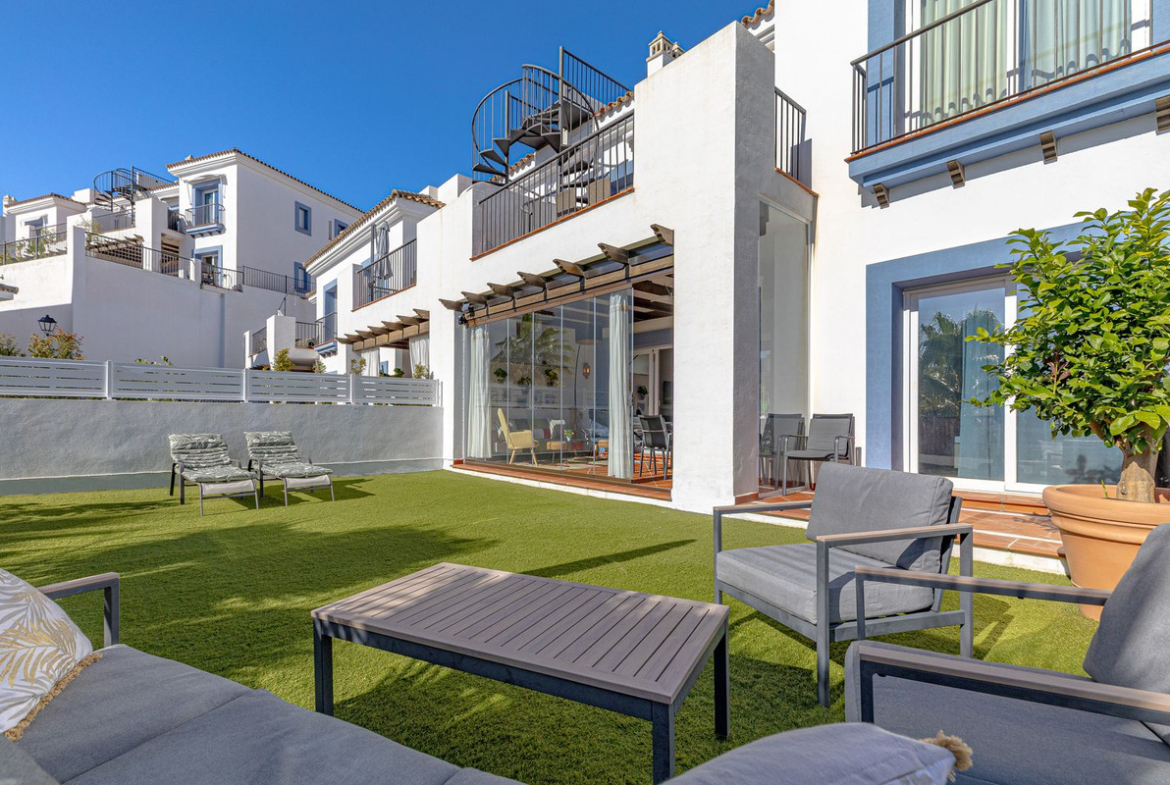 Welcome to this modern and stylish home in the popular Paraiso Pueblo in Benahavís. Here you are greeted by a bright residence with an open-plan layout where the kitchen and living room blend harmoniously together. The kitchen is tastefully designed with decorative tiling, integrated appliances, and a spacious kitchen island that creates a natural gathering point.