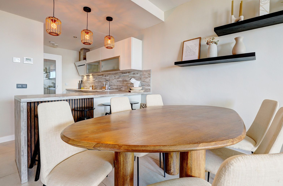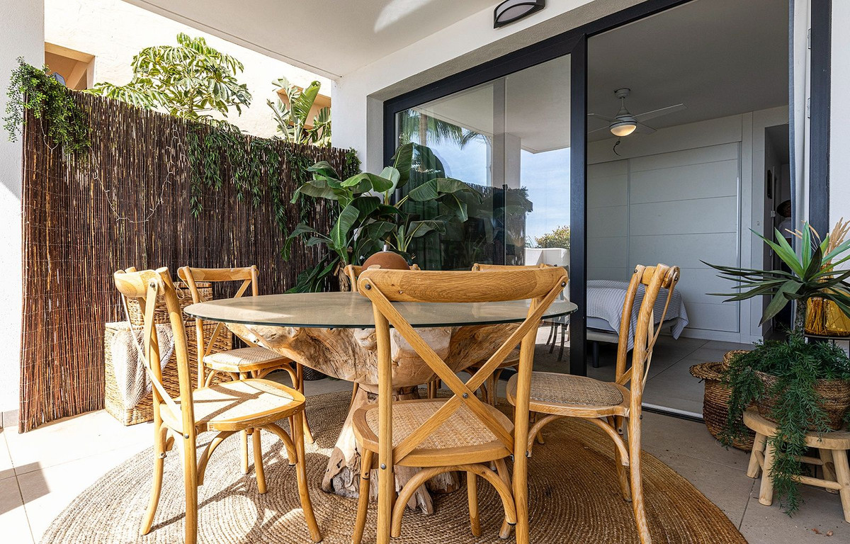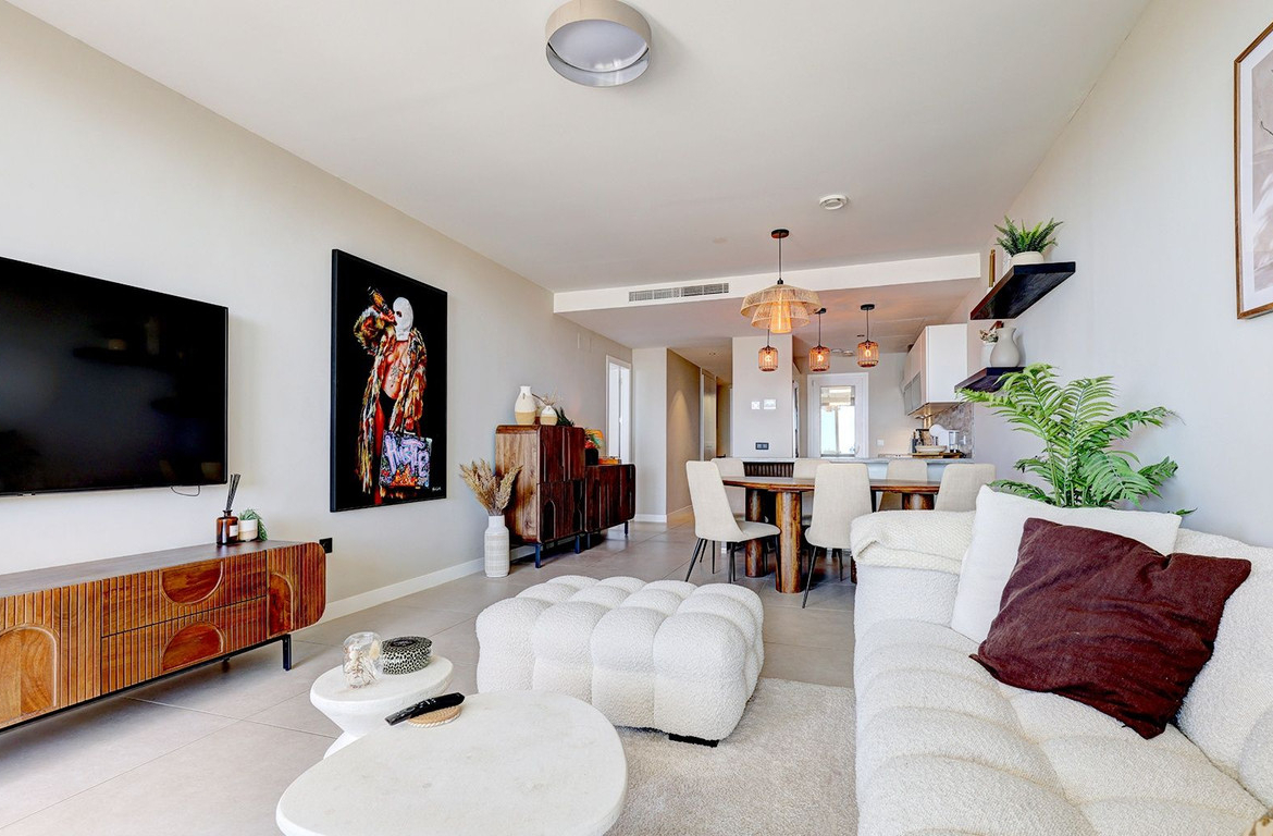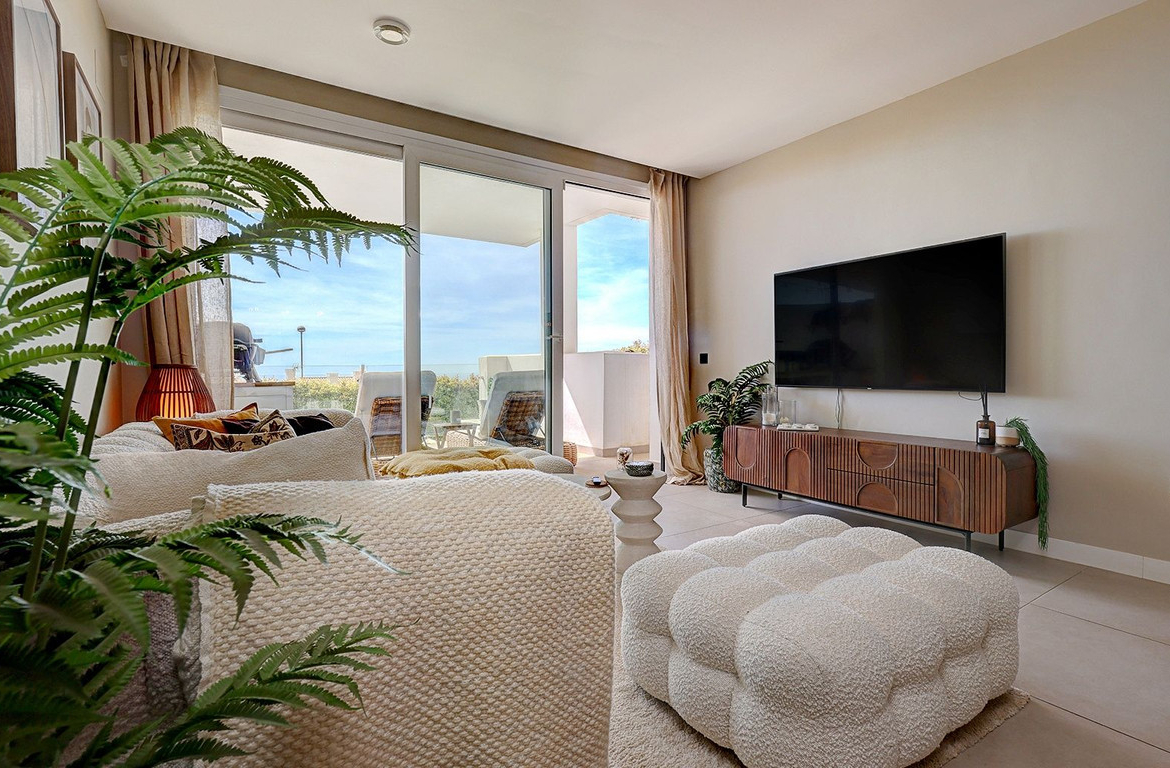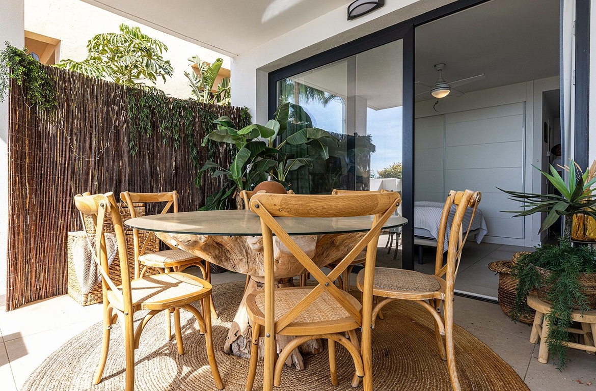This beautifully presented modern apartment with a private garden offers a stylish open-plan living and dining area, complemented by a fully equipped kitchen featuring high-end SIEMENS appliances. The living space seamlessly extends to a private terrace, creating the perfect setting for indoor-outdoor living, while the private garden provides additional outdoor space to fully enjoy the Mediterranean lifestyle.