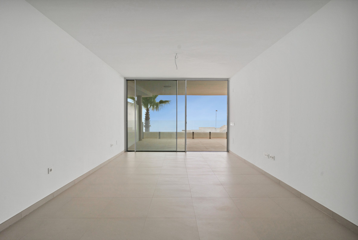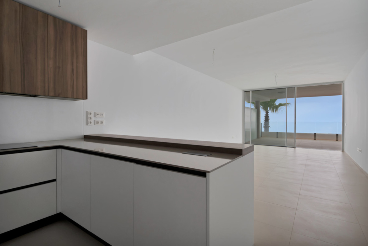 The property features a bright and spacious living/dining area with large windows and access to a vast, serene terrace. The living area offers beautiful sea views from the inside. The large L-shaped terrace surrounding the apartment provides stunning panoramic sea views and generous space for relaxing and outdoor dining.