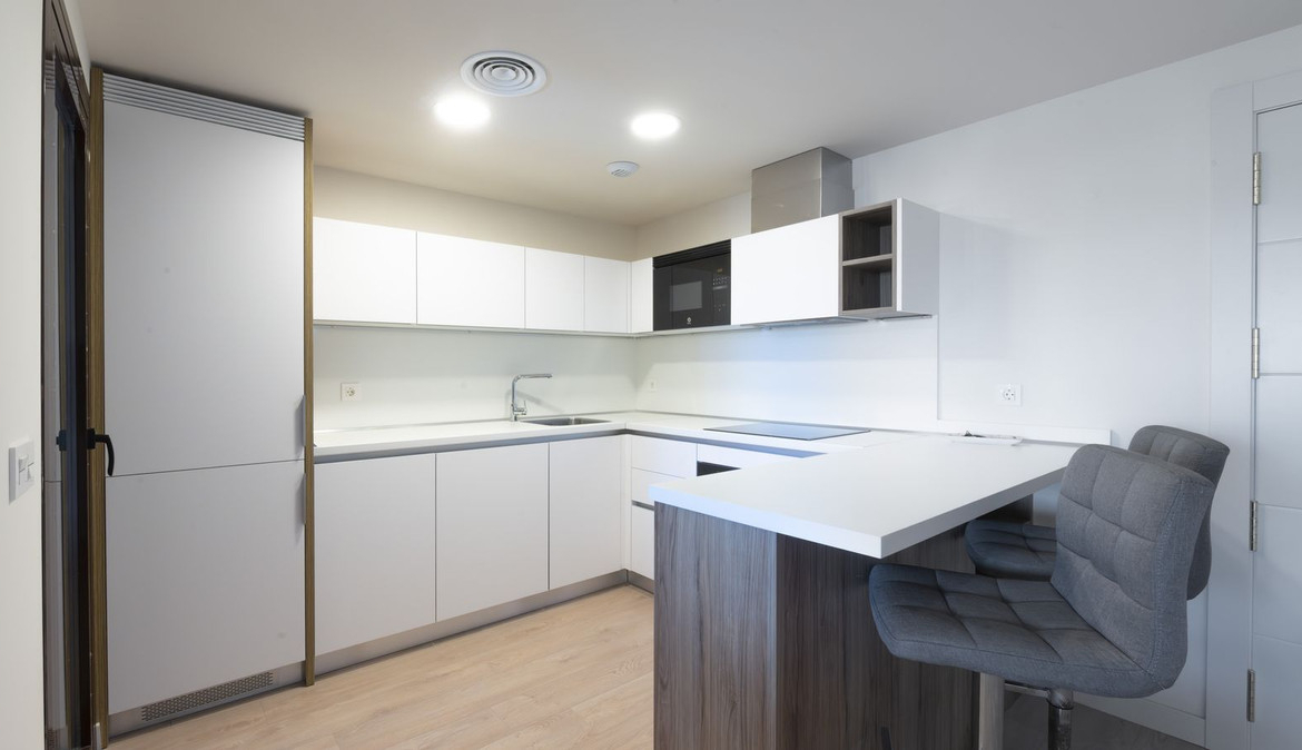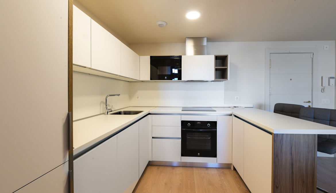 Fully fitted kitchen open to the living room, laundry room, covered terrace and magnificent views, from which you access the solarium.