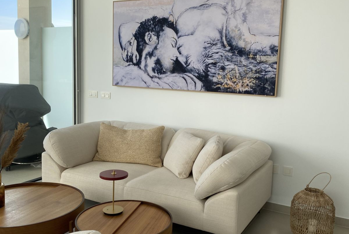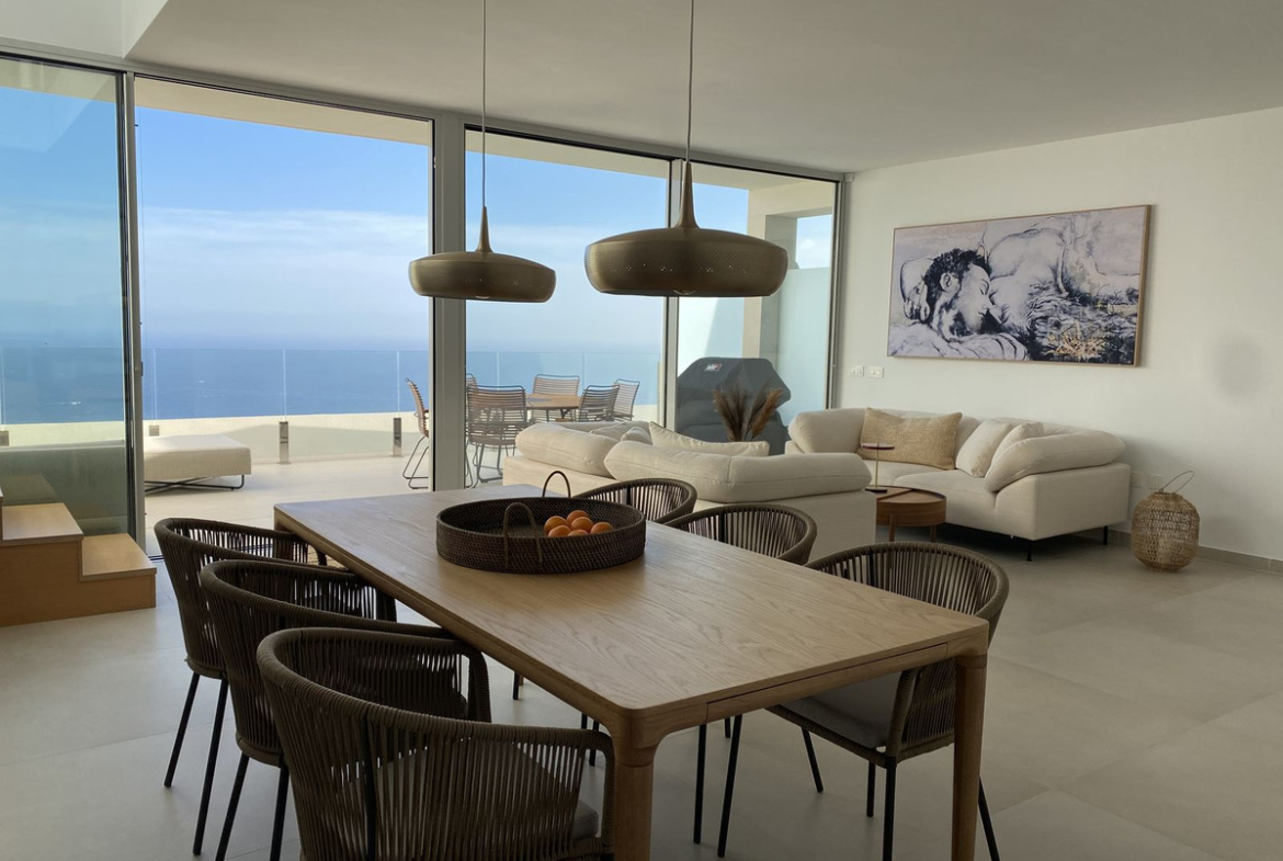 Upon entering the property, you are welcomed by an elegant entrance hall that opens into a spacious and bright open-plan living and dining area. The sophisticated Italian-designed kitchen is fully fitted and equipped with high-end appliances, including a reverse osmosis water filtration system. Large sliding windows from the living area lead directly to a generous terrace where you can enjoy stunning sea views and outdoor living.