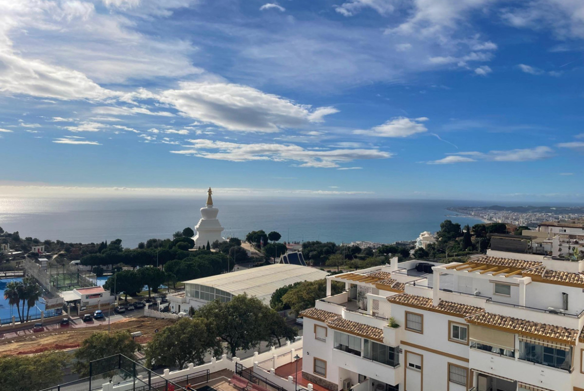 Discover this spectacular apartment in one of the most sought-after locations in Benalmádena Pueblo, opposite the iconic Buddhist Stupa. With a south-facing orientation, it boasts stunning views of the Mediterranean Sea and a peaceful, privileged setting.