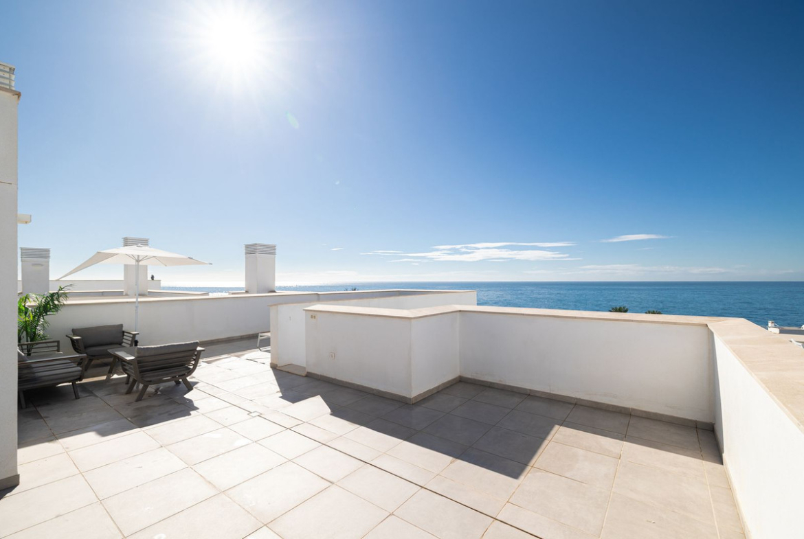 The bright, open-plan interior features a seamless blend of the dining area, living room, and fully equipped kitchen with integrated appliances, all opening onto a terrace perfect for starting your day admiring the blue Mediterranean. For ultimate outdoor enjoyment, you have your own private rooftop terrace, ideal for sunbathing or organising unforgettable dinner parties with breathtaking views.