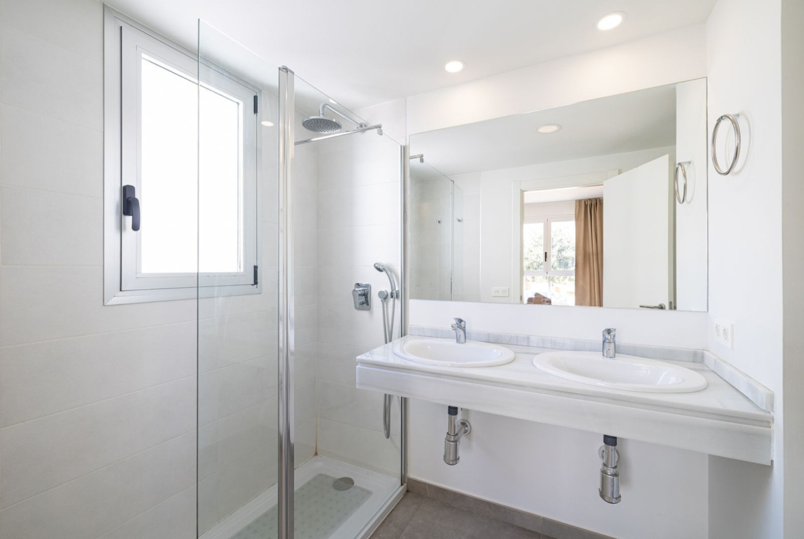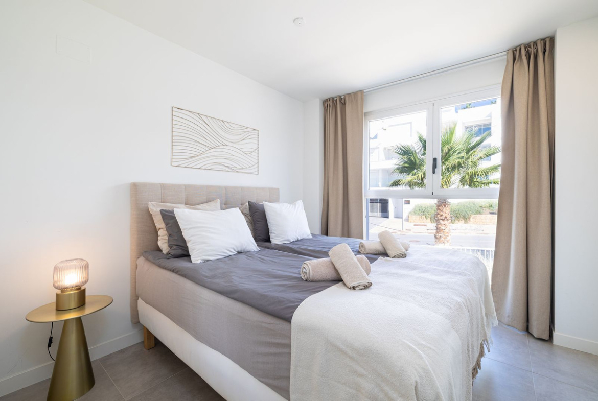 The three spacious bedrooms, all featuring inbuilt wardrobes and large windows, are thoughtfully situated on the opposite side of the apartment for maximum privacy. The master bedroom includes an ensuite bathroom with a double sink, and one of the guest bedrooms benefits from a small private terrace. Residents of the community enjoy two superb outdoor pools—one for distance swimming and a chill-out pool, with handicap access—in a sustainable development just 100 meters from the beach.