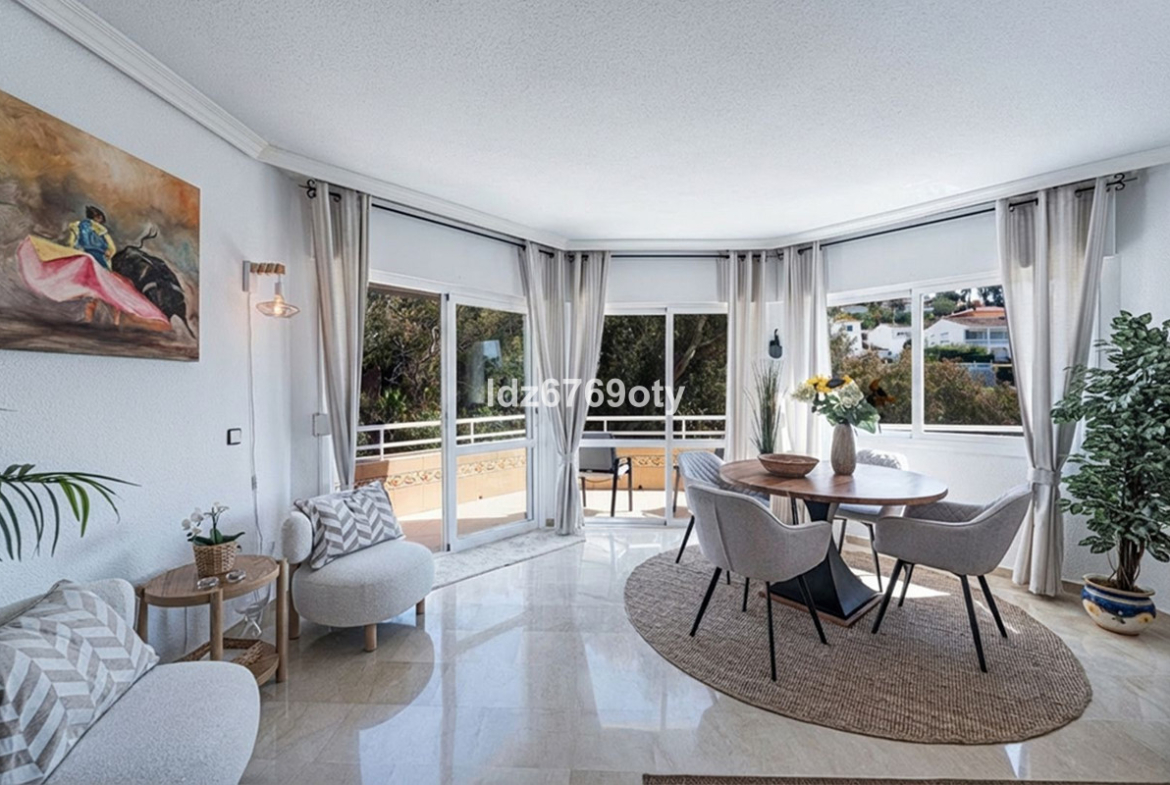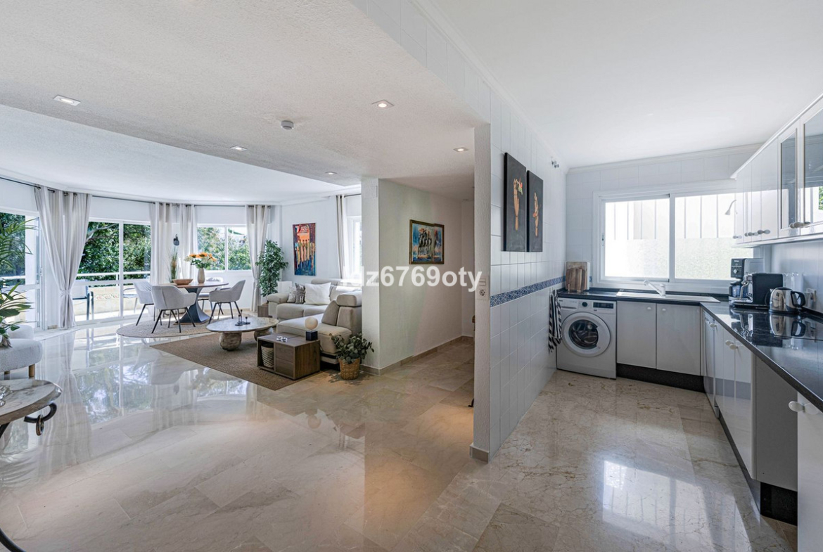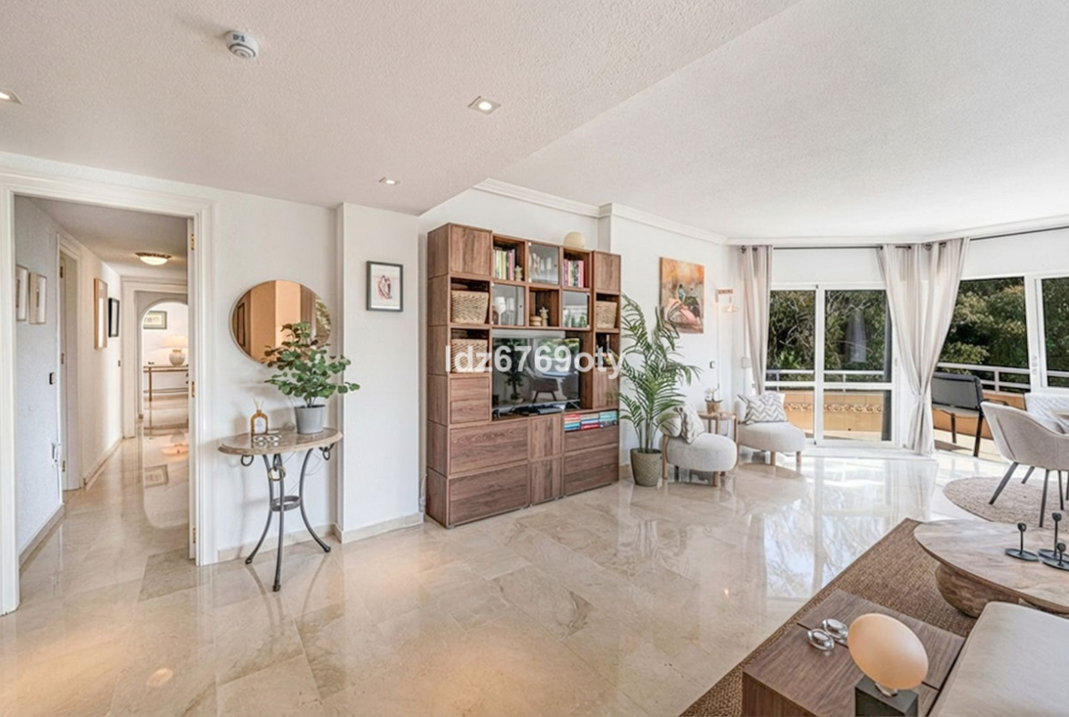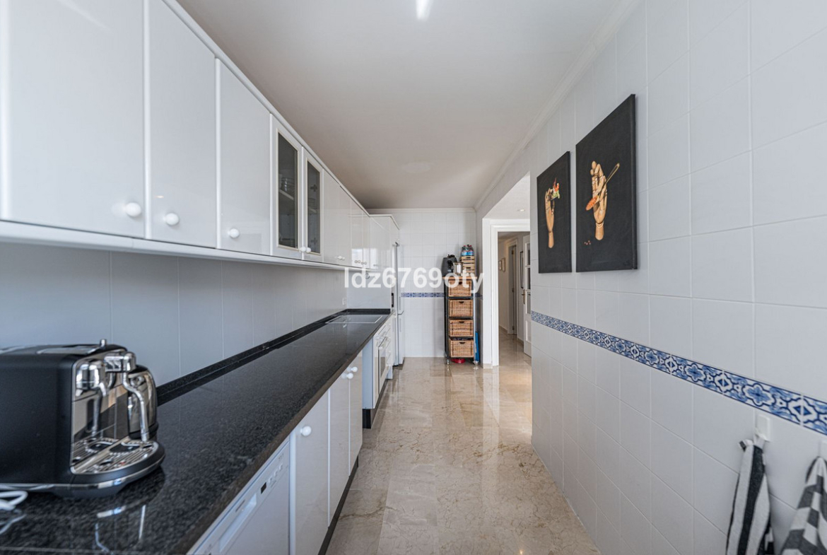 A spacious and very well-maintained luxury apartment in a prime location next to the popular Torrequebrada Golf Course in Benalmádena Costa! This spacious and light-filled corner apartment is situated in the beautifully maintained small-scale ‘Palmeras del Golf’ urbanisation, featuring numerous palm trees and gardens and boasting two swimming pools. The 3-bedroom apartment features a large master bedroom with an en-suite bathroom with double sinks and built-in cupboards, a bath and a toilet. The other two spacious bedrooms share a second bathroom, which also features double sinks and built-in cupboards, a large walk-in shower and a toilet. All bedrooms are fitted with spacious built-in wardrobes and air conditioning units for both cooling and heating.