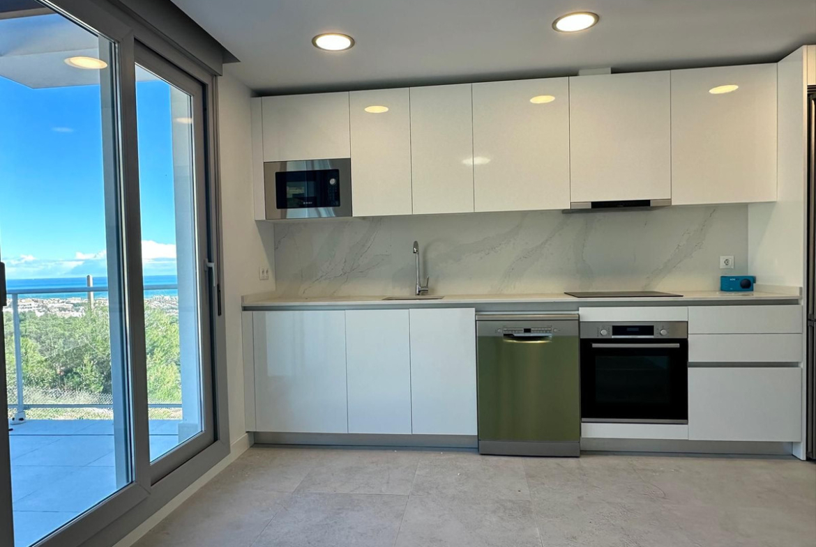 The apartment itself is incredibly spacious and filled with natural light. The open-plan living area and fully equipped kitchen, complete with top-of-the-line Bosh appliances under a 2-year guarantee, lead out to a terrace with stunning sea and mountain views. The terrace also features an outdoor kitchen with a barbecue, perfect for entertaining and enjoying the beautiful surroundings. The night space offers 3 double bedrooms and 2 stunning bathrooms, providing ample space for relaxation and comfort.