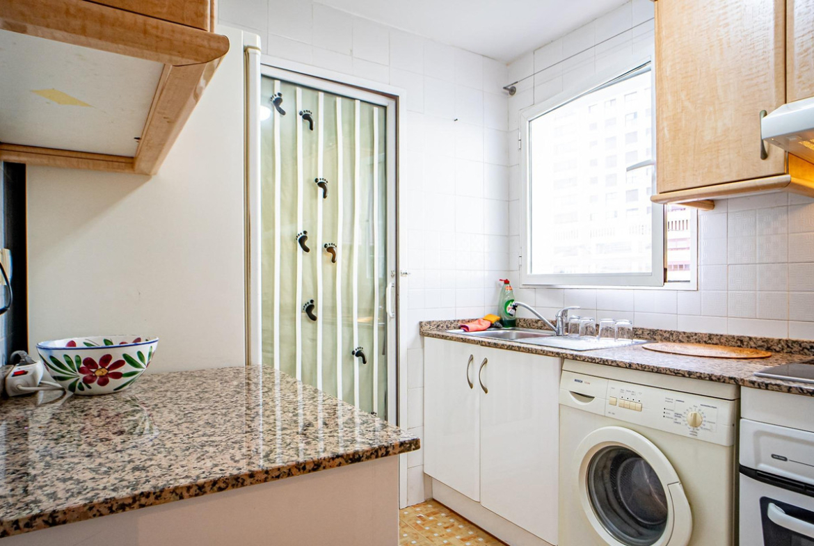 This bright corner apartment is located in the Juzgados area of Benidorm. The property features 3 bedrooms, 2 full bathrooms (one en suite), a kitchen with pantry, and a spacious living-dining room. From the living room and two of the bedrooms, there is access to a large glazed terrace with open views and even a glimpse of the sea.