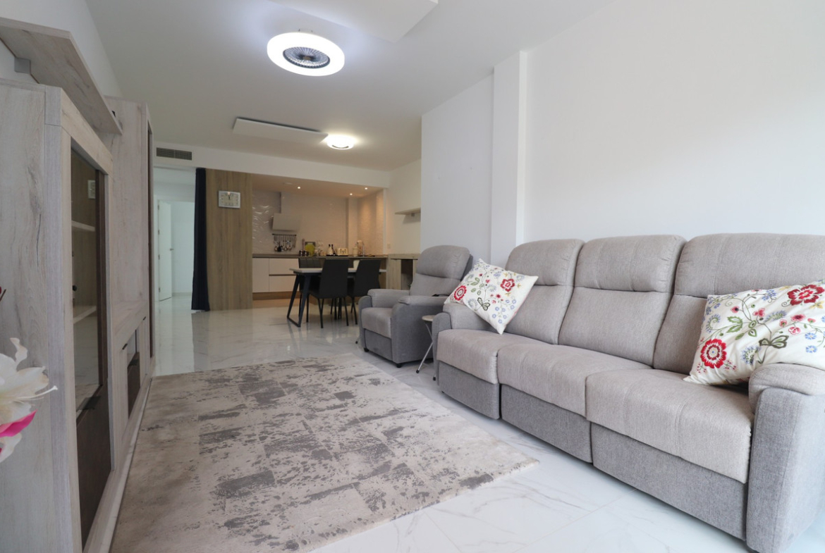 This East Facing, Three Bedroom, Ground Floor Apartment in benijofar, is located, within a 5 minute walk to the nearest shop, bars, restaurants and bakery, and only a 2 minute drive to a main brand supermarket. The beautiful beaches of the Costa Blanca South can be reached in approximately 15 minutes. The property offers a spacious 100m² build set on a 112m² plot, featuring an open plan kitchen leading through to the lounge, which is fitted with ducted air conditioning. From here, sliding doors open out to a private front terrace, ideal for relaxing or dining outdoors. There are three double bedrooms with fitted wardrobes, one of which benefits from its own terrace and en suite bathroom, while a family bathroom serves the rest of the property. Ducted air conditioning is installed throughout the bedrooms for added comfort. The complex benefits from a communal pool, and the property also includes basement parking and a private store room. A fantastic opportunity for either a holiday home or permanent living in the heart of Costa Blanca South.