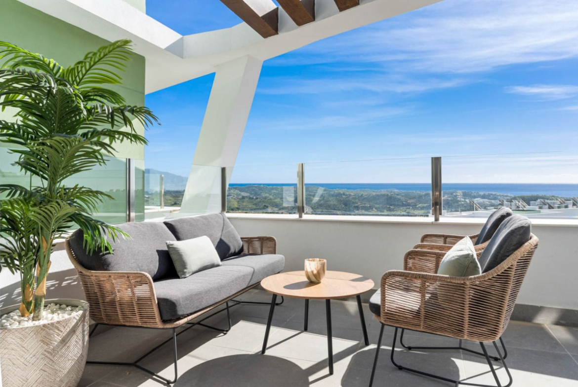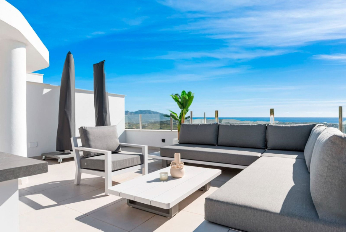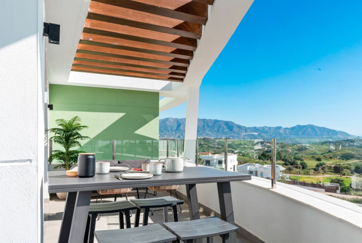 Nestled within the prestigious Calanova Golf community, this exquisite penthouse duplex promises a luxurious lifestyle, enveloped in the serene beauty of the Spanish countryside. With 3 spacious bedrooms and 2 elegant bathrooms, this property exemplifies modern sophistication fused with traditional charm. As you step into this unique residence, you're immediately greeted by a sense of openness and light, courtesy of its expansive design and large windows. The lower level features a bright and airy living area that seamlessly combines the living and dining spaces, perfect for both entertaining and relaxation. Tasteful decor, combined with high-quality finishes, creates an inviting atmosphere. Adjacent to the living area, an elegantly appointed kitchen awaits, boasting top-of-the-line appliances and ample counter space topped with beautiful stone surfaces—ideal for the culinary enthusiast. The spacious living area flows effortlessly to a cozy terrace, where breathtaking panoramic views of the lush greens of Calanova Golf and the sparkling Mediterranean Sea can be enjoyed. This is the perfect setting for morning coffees or evening gatherings under the stars. As you make your way upstairs, you will discover the private sun terrace, offering another vantage point to soak in the stunning vistas. The 3 bedrooms are generously sized, providing flexibility for guests, family, or even a home office. This penthouse duplex is designed with comfort and convenience in mind, featuring air conditioning throughout, quality built-in wardrobes, and secure underground parking. The property also boasts access to communal areas, including beautifully landscaped gardens and a sparkling swimming pool, enhancing the overall living experience. Located just a short drive from the picturesque beaches of La Cala de Mijas and the vibrant town of Fuengirola, residents here enjoy the best of both worlds—the tranquility of residential life paired with the excitement of coastal living. A wealth of amenities, including shops, restaurants, and recreational facilities, are all within easy reach. Whether you seek a holiday retreat, a family home or an investment opportunity, this penthouse duplex in Calanova Golf offers unmatched luxury in a breathtaking setting. Fully furnished, 2 car spaces, storage and a tourist licence is in place! Don't miss the chance to make this dream property yours. Schedule a viewing today and experience the allure of this remarkable home firsthand!