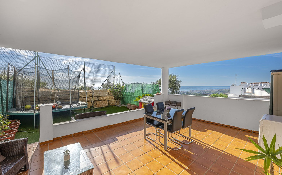 The house has **3 bedrooms**, a living room, a modern kitchen and a design that maximises the use of space. It has a **large covered terrace of 29m²** and a **private garden of 32m²**, from which you can enjoy **panoramic sea views**.