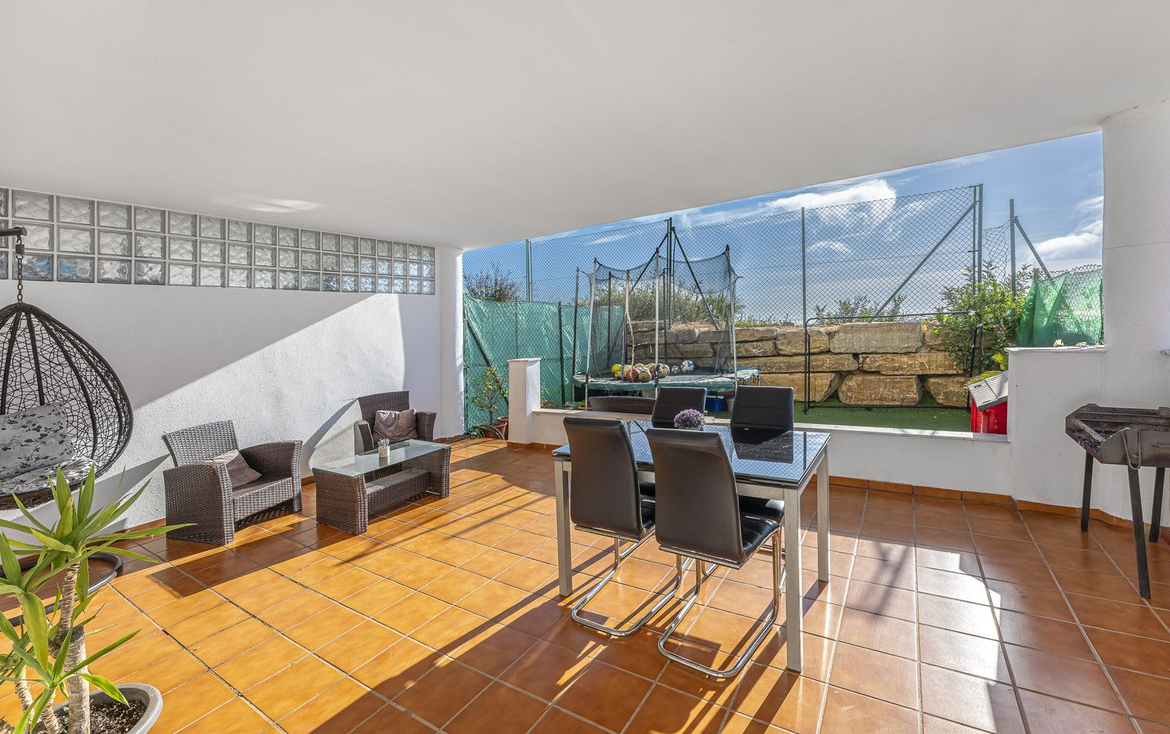 The house has **3 bedrooms**, a living room, a modern kitchen and a design that maximises the use of space. It has a **large covered terrace of 29m²** and a **private garden of 32m²**, from which you can enjoy **panoramic sea views**.