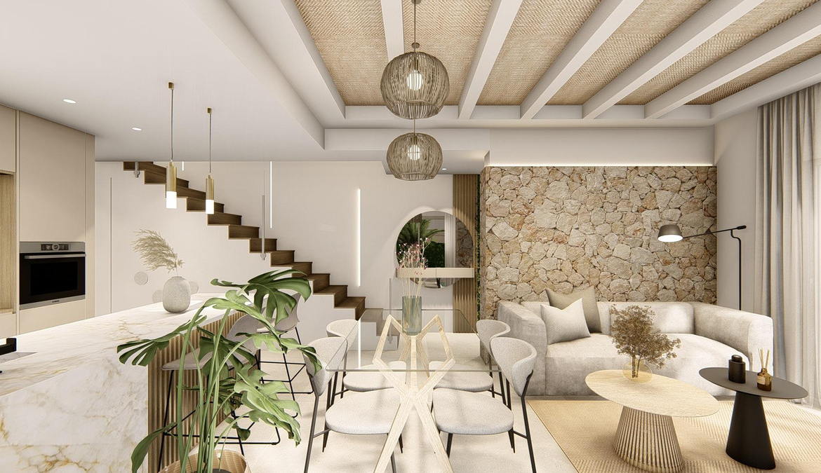 As soon as you enter, natural light fills the open spaces of the living room and kitchen, thanks to the large windows that connect the interior with the exterior. The living room, decorated in neutral tones and quality materials, invites you to relax. The kitchen, modern and fully equipped, has an elegant marble island wooden finishes, designed both for day-to-day living and for receiving guests.
