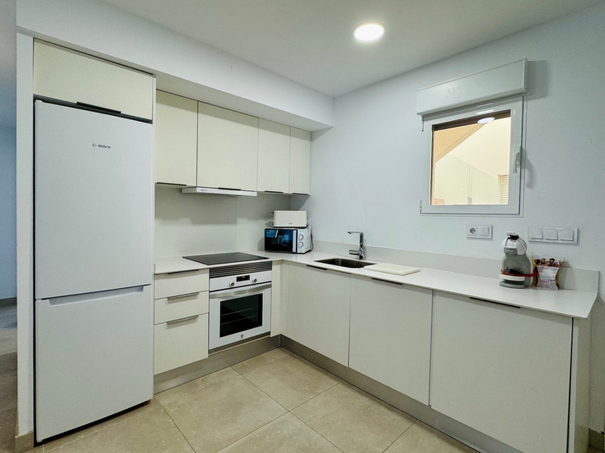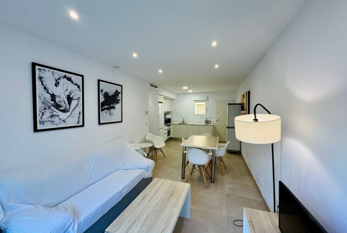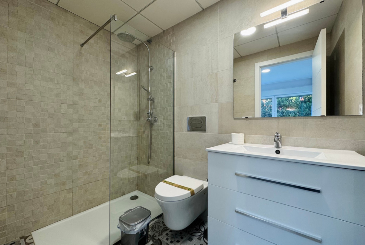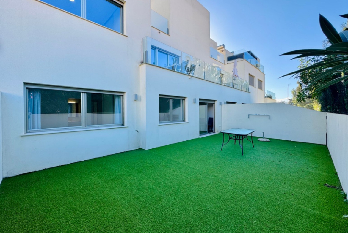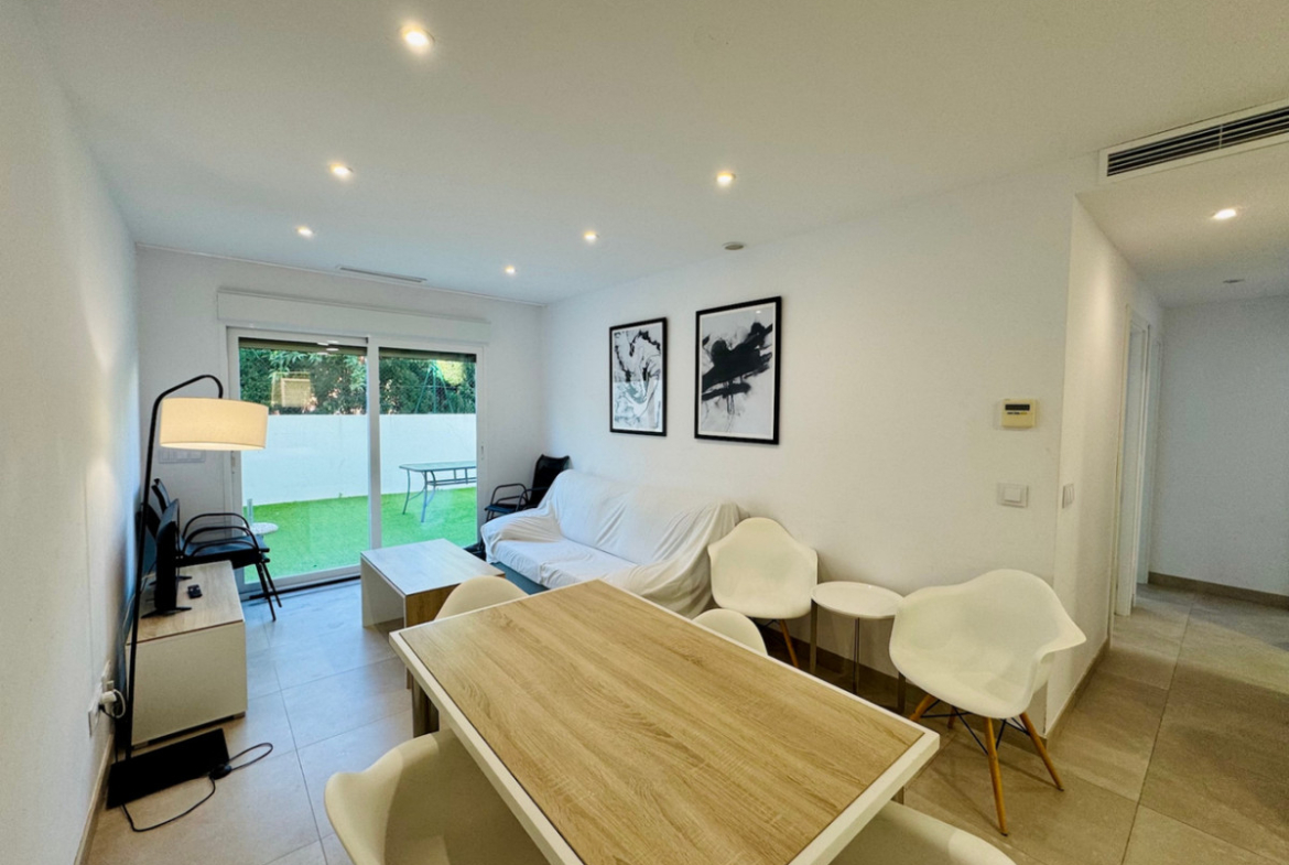 The secure front door gives access to a bright living room with a fully equipped American kitchen, which is perfectly connected to the garden thanks to its open layout and large windows. The apartment has a comfortable master bedroom with built-in closets and an ensuite bathroom, a second double bedroom with also built-in closets, and a third smaller bedroom. In addition, there is a separate bathroom with shower, ideal for guests or family members.