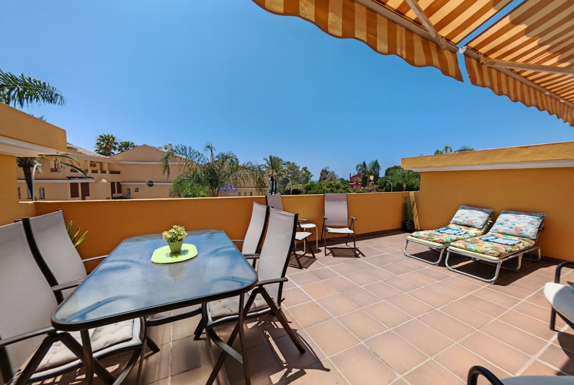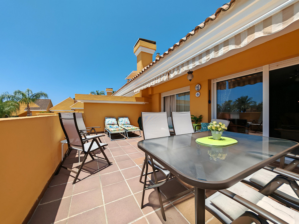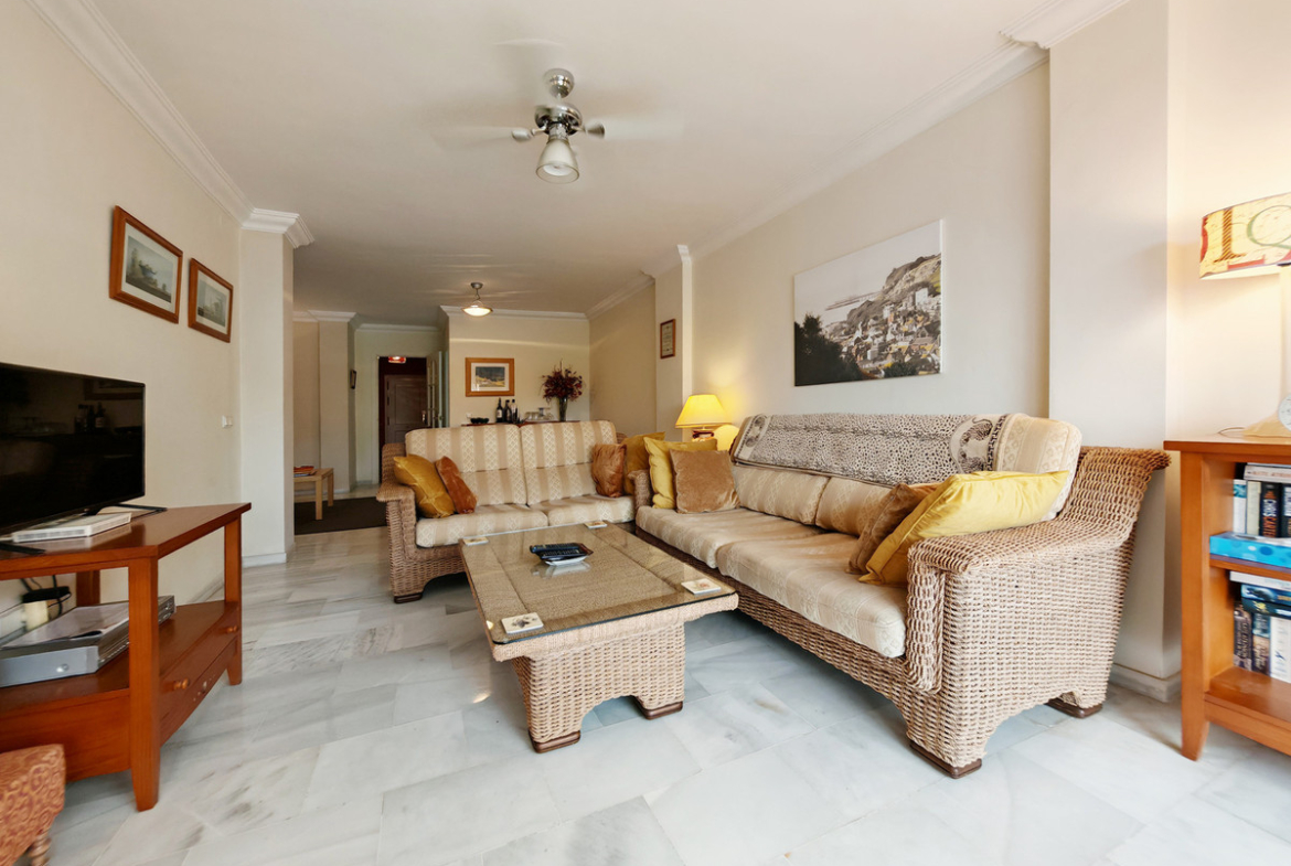 Apartment for sale in Elviria, Marbella with 3 bedrooms, 2 bathrooms and 1 on suite bathroom, with communal swimming pool, private garage and communal garden. Regarding property dimensions, it has 128 m² built, 108 m² interior and 20 m² terrace. Has the following facilities amenities near, transport near, air conditioning, fully fitted kitchen, marble floors, storage room, private terrace, kitchen equipped, sea view, internet – wi-fi, gated community, pool view, beachside, close to children playground, close to sea / beach, uncovered terrace, good condition, ceiling cooling system, ceiling heating system, close to shops, close to town, close to schools and surveillance cameras.