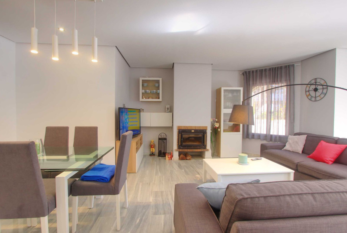 The property features three bedrooms and two bathrooms, a bright living room with floor-to-ceiling windows that open onto a generous terrace with a private Jacuzzi, ideal for relaxing or entertaining. A cozy fireplace in the living area adds a warm touch for year-round living.