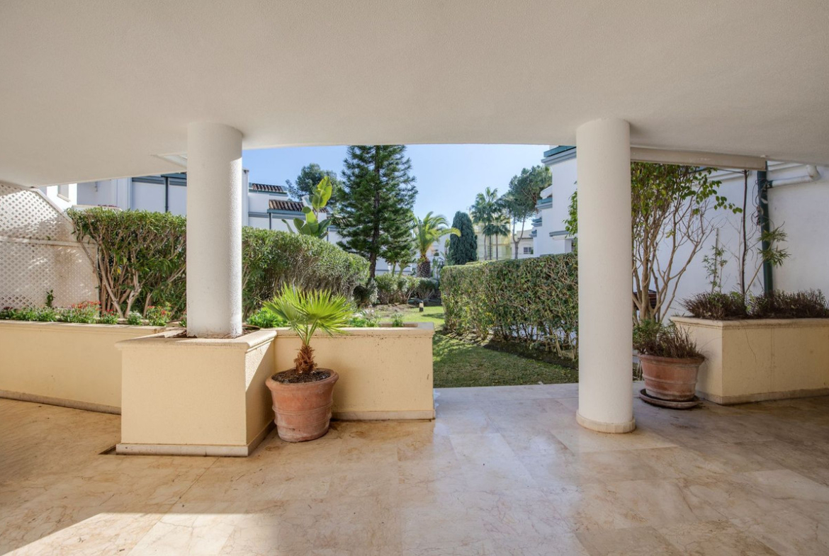 The apartment offers over 220 sqm of interior living space arranged across two levels, a size that has become increasingly uncommon in beachfront developments, making it an ideal canvas for a comprehensive renovation project aimed at enhancing value, functionality and design. Its south-facing orientation ensures abundant natural light throughout the day, while the interior flows seamlessly onto a spacious terrace and private-use garden, creating a natural connection between indoor and outdoor living areas.