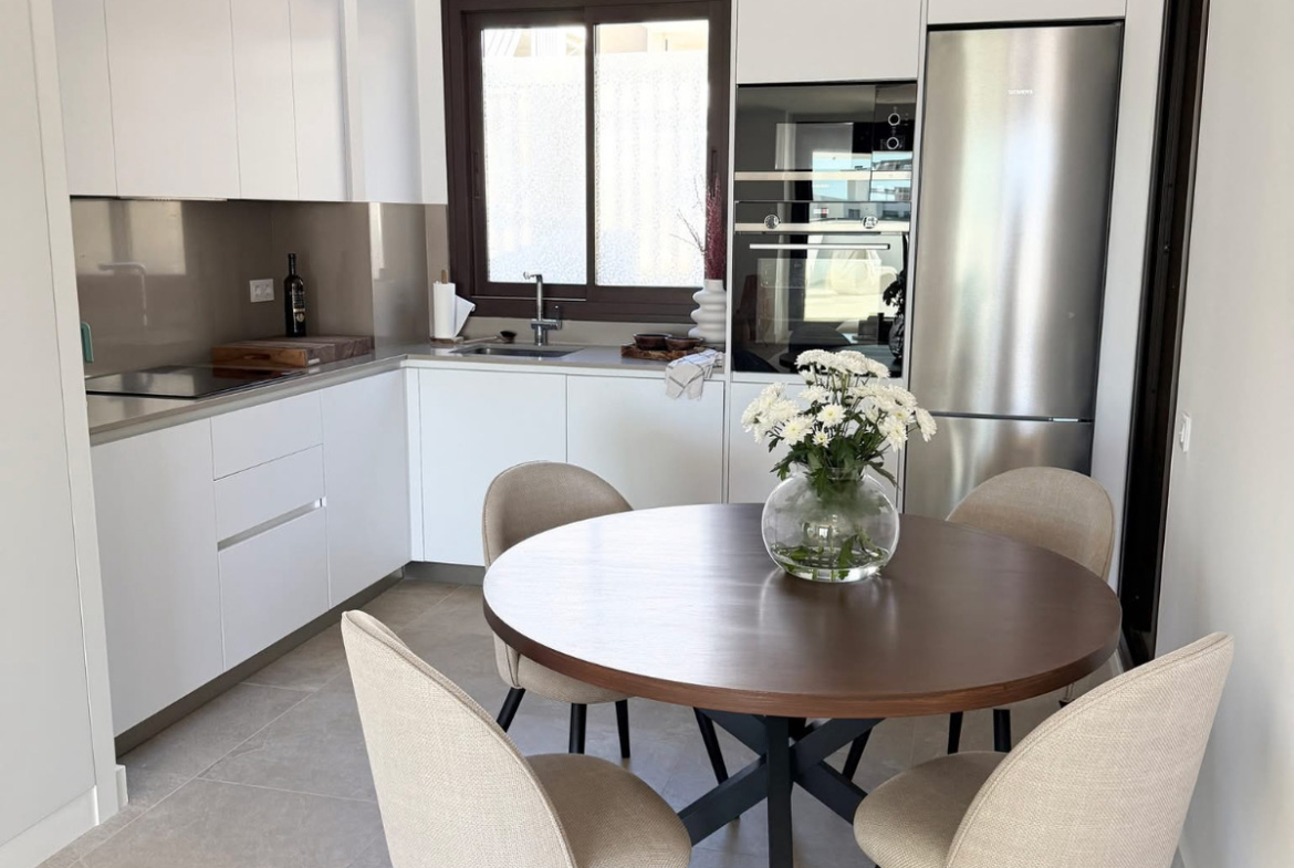 The property boasts 100 m² of built living space, featuring three spacious bedrooms, and two elegant modern bathrooms finished with high-quality materials. The bright open-plan kitchen and living area creates a seamless flow between indoor and outdoor living, enhanced by large windows that flood the space with natural light.
