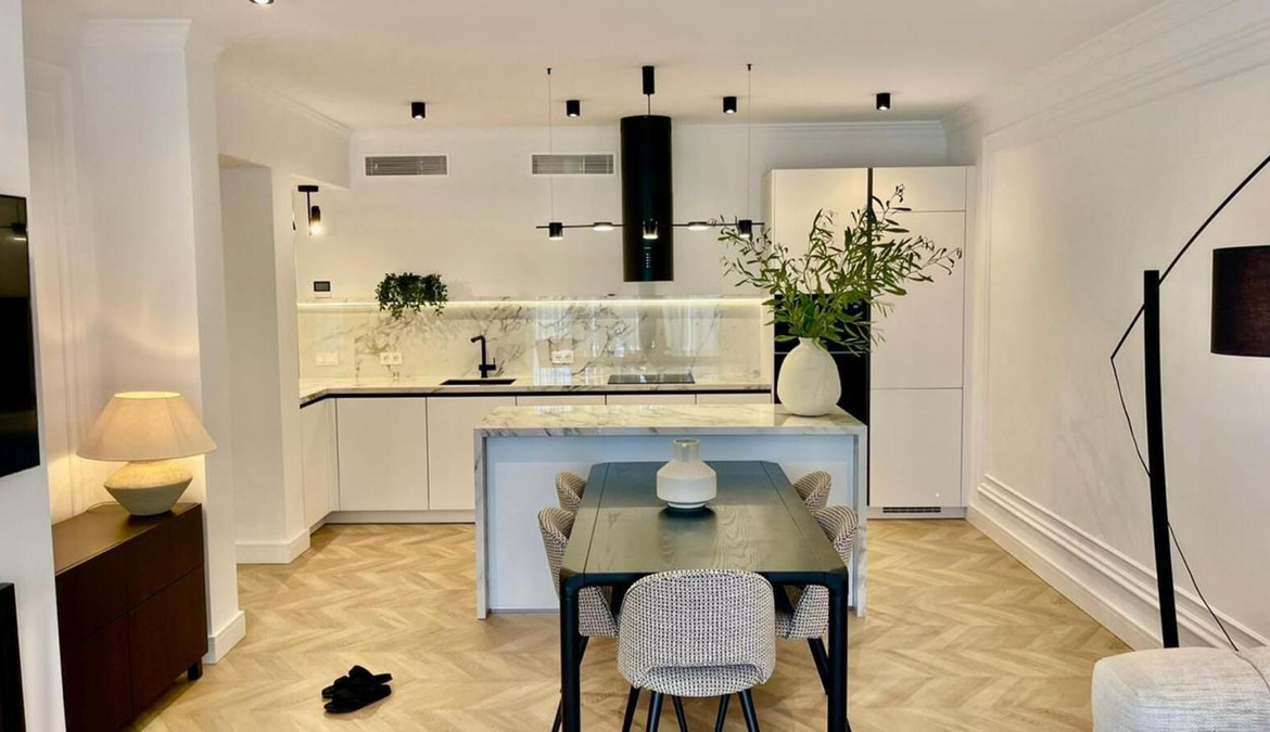 The apartment has been recently renovated and is decorated in a modern style using high-quality materials and stylish design solutions.