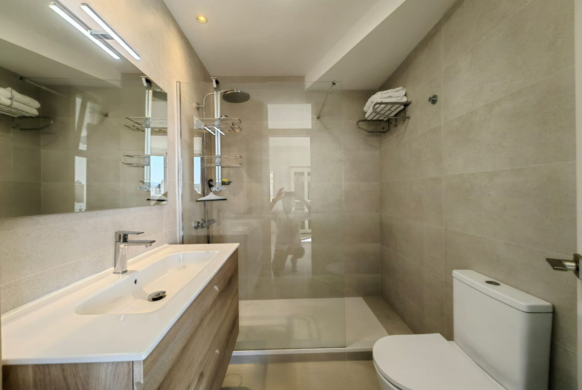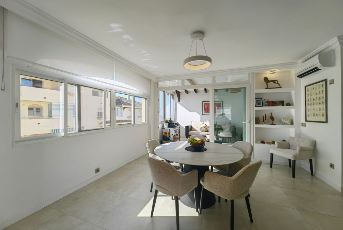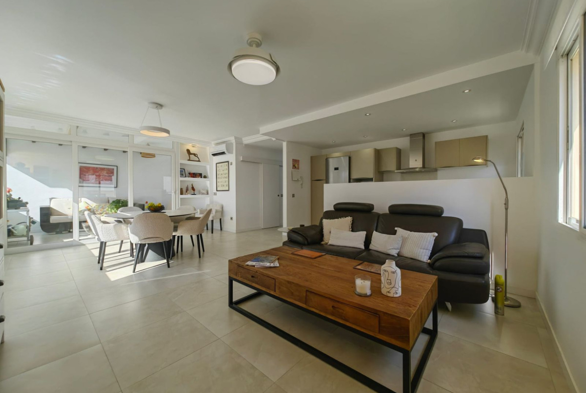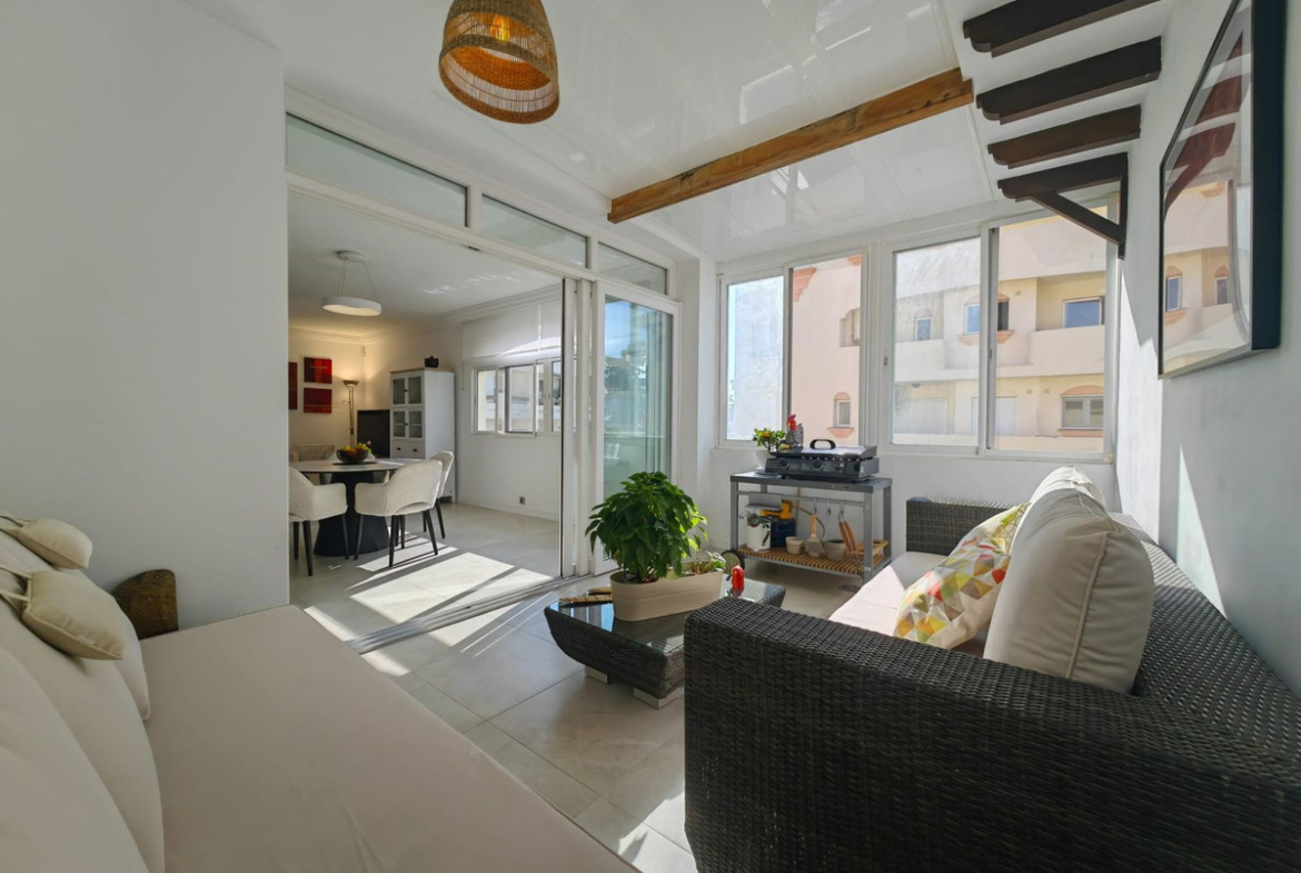 The apartment welcomes you with an elegant central lobby. To the right, a spacious open-plan kitchen, dining, and lounge area unfolds, seamlessly connecting to a covered terrace with a fully furnished lounge — ideal for enjoying sunny mornings and the cooler shade of the afternoons thanks to its southeast orientation.