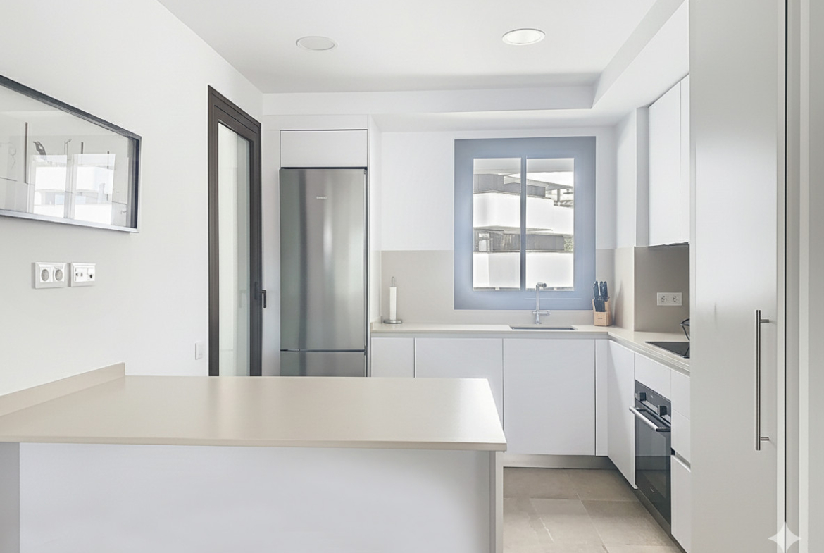 The main floor of the penthouse is designed for both comfort and practicality. The spacious living area benefits from porcelain floors, double glazing, and glass doors that open onto a private terrace, allowing natural light to flood the interior and providing urban and sea views. The open plan, fully fitted kitchen is equipped with modern appliances, a peninsula and includes a dedicated laundry room, making daily routines efficient.